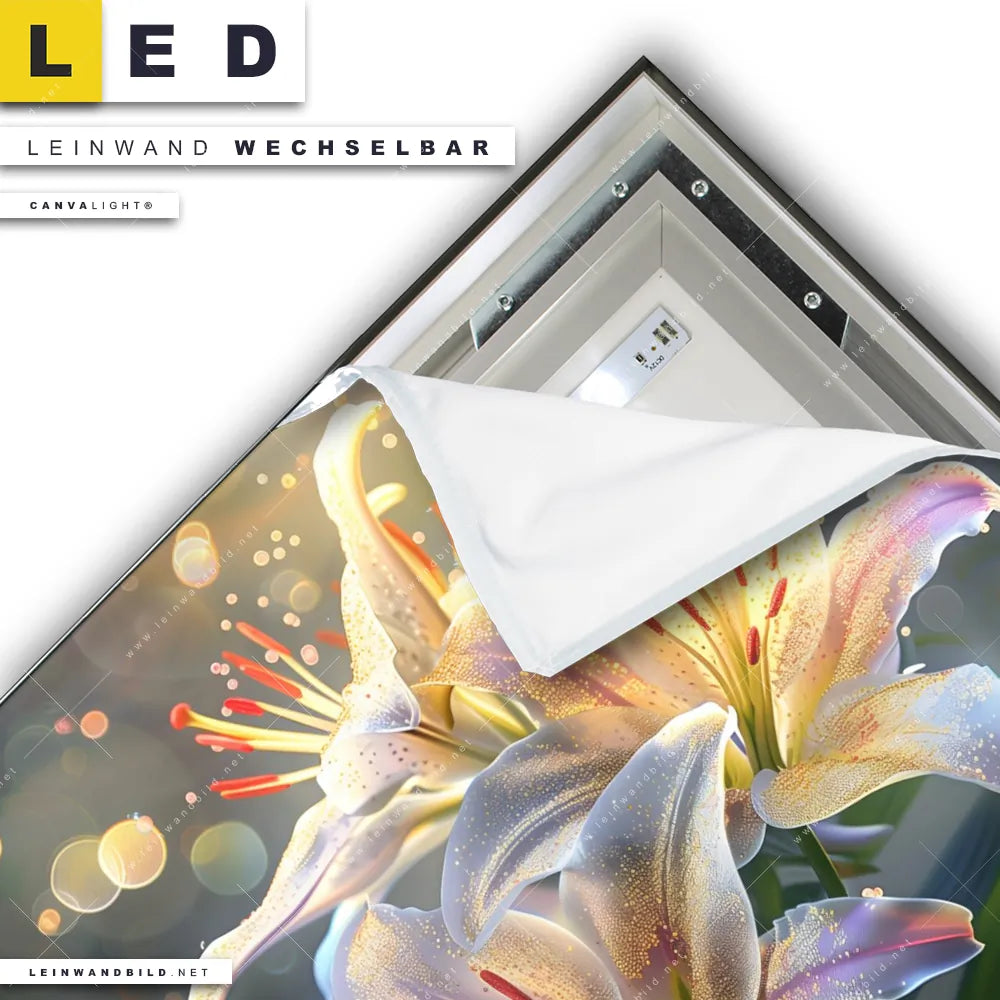 Du konfigurierst Dein individuelles LED Leinwandbild Canvalight® TEX | Lilien im Morgenlicht | Quadrat und wir produzieren es NEU für Dich. Unsere Blumen - Botanik LED Bilder mit wechselbarer Textil-Leinwand sind KEINE Lagerware. Du bist Dir unsicher, welches Motiv oder Format das richtige für dein individuelles Canvalight® Leuchtbild ist, dann helfen wir dir gerne weiter und beraten dich!