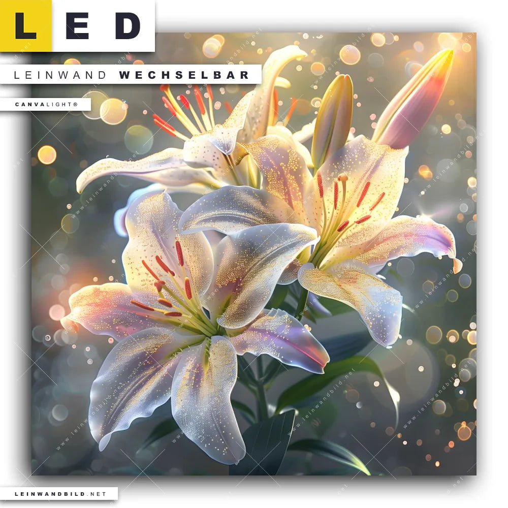 Du bist auf der Suche nach einem Blumen - Botanik LED Leinwandbild im Quadratischen Format? Begriffe wie Blumen, Pflanze, Natur, Blüten, Glitzer, Sonnenlicht, Lilien, Frühling haben Dich auf der Suche nach Deinem neuen XXL LED Wandbild mit wechselbarer Leinwand inspiriert? Farben wie Weiss, Rosa dürfen auf Deinem neuen Leinwand-LED-Bild nicht fehlen und Leuchtbilder im Floral, Modern Art Stil passen perfekt zu Deinem Einrichtungsstil?