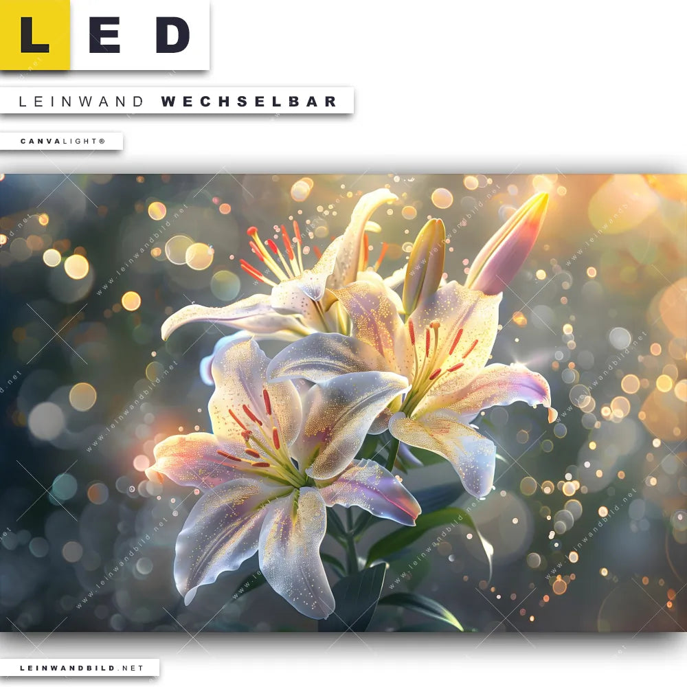 Du bist auf der Suche nach einem Blumen - Botanik LED Leinwandbild im Querformat? Begriffe wie Blumen, Pflanze, Natur, Blüten, Glitzer, Sonnenlicht, Lilien, Frühling haben Dich auf der Suche nach Deinem neuen XXL LED Wandbild mit wechselbarer Leinwand inspiriert? Farben wie Weiss, Rosa dürfen auf Deinem neuen breiten Leinwand-LED-Bild nicht fehlen und Leuchtbilder im Floral, Modern Art Stil passen perfekt zu Deinem Einrichtungsstil?