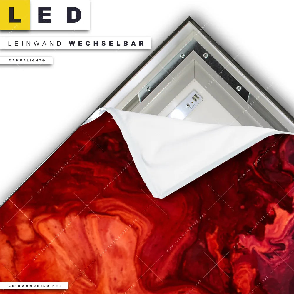 Du konfigurierst Dein individuelles LED Leinwandbild Canvalight® TEX | Liquid Marmor rot | Panorama und wir produzieren es NEU für Dich. Unsere Muster - Texturen LED Bilder mit wechselbarer Textil-Leinwand sind KEINE Lagerware. Du bist Dir unsicher, welches Motiv oder Format das richtige für dein individuelles Canvalight® Leuchtbild ist, dann helfen wir dir gerne weiter und beraten dich!