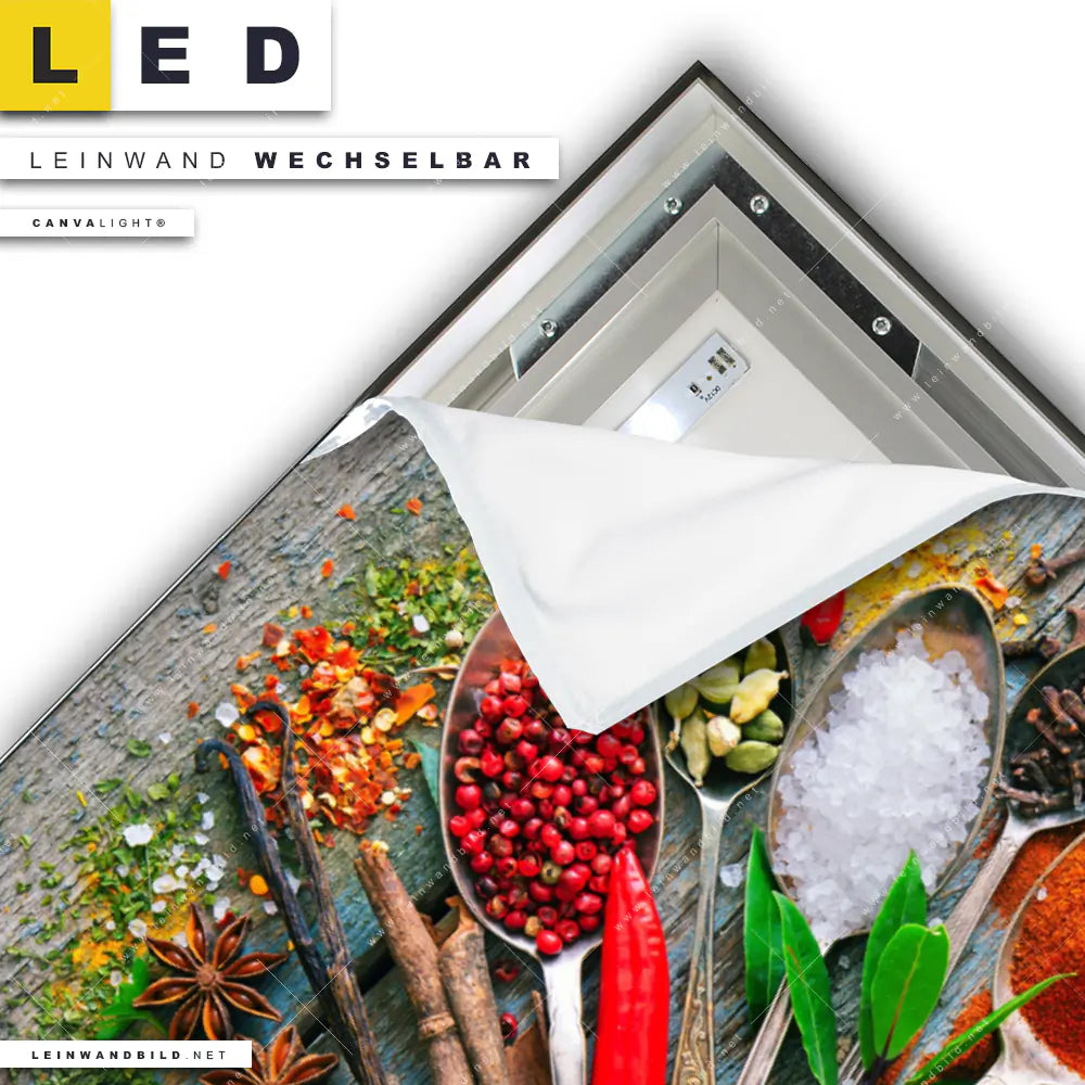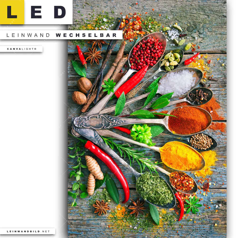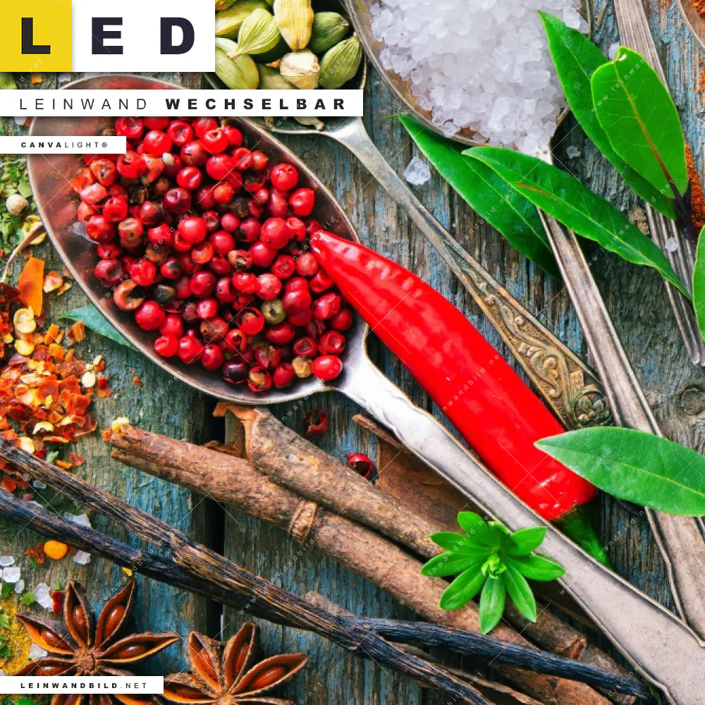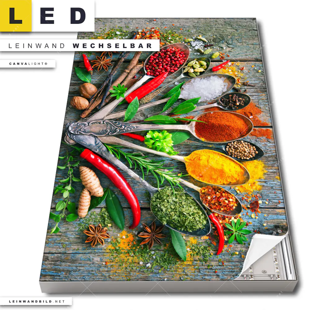 Du bist auf der Suche nach einem Essen - Trinken LED Leinwandbild im Hochformat? Begriffe wie Gewürze, Kräuter, Löffel, kochen, Besteck haben Dich auf der Suche nach Deinem neuen XXL LED Wandbild mit wechselbarer Leinwand inspiriert? Farben wie Bunt, Braun, Silber, Rot, Grün, Gelb dürfen auf Deinem neuen Leinwand-LED-Bild nicht fehlen und Leuchtbilder im Natürlich - Realistisch, Retro - Vintage Stil passen perfekt zu Deinem Einrichtungsstil?