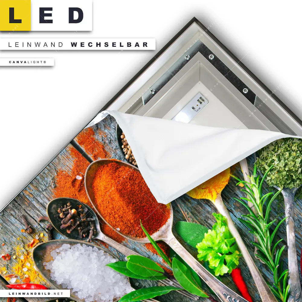 Du konfigurierst Dein individuelles LED Leinwandbild Canvalight® TEX | Löffel mit Kräutern und Gewürzen | Quadrat und wir produzieren es NEU für Dich. Unsere Essen - Trinken LED Bilder mit wechselbarer Textil-Leinwand sind KEINE Lagerware. Du bist Dir unsicher, welches Motiv oder Format das richtige für dein individuelles Canvalight® Leuchtbild ist, dann helfen wir dir gerne weiter und beraten dich!