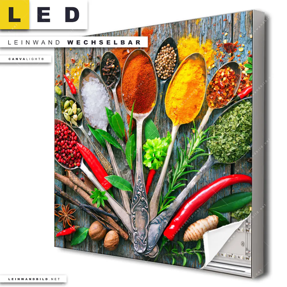 Du bist auf der Suche nach einem Essen - Trinken LED Leinwandbild im Quadratischen Format? Begriffe wie Gewürze, Kräuter, Löffel, kochen, Besteck haben Dich auf der Suche nach Deinem neuen XXL LED Wandbild mit wechselbarer Leinwand inspiriert? Farben wie Bunt, Braun, Silber, Rot, Grün, Gelb dürfen auf Deinem neuen Leinwand-LED-Bild nicht fehlen und Leuchtbilder im Natürlich - Realistisch, Retro - Vintage Stil passen perfekt zu Deinem Einrichtungsstil?