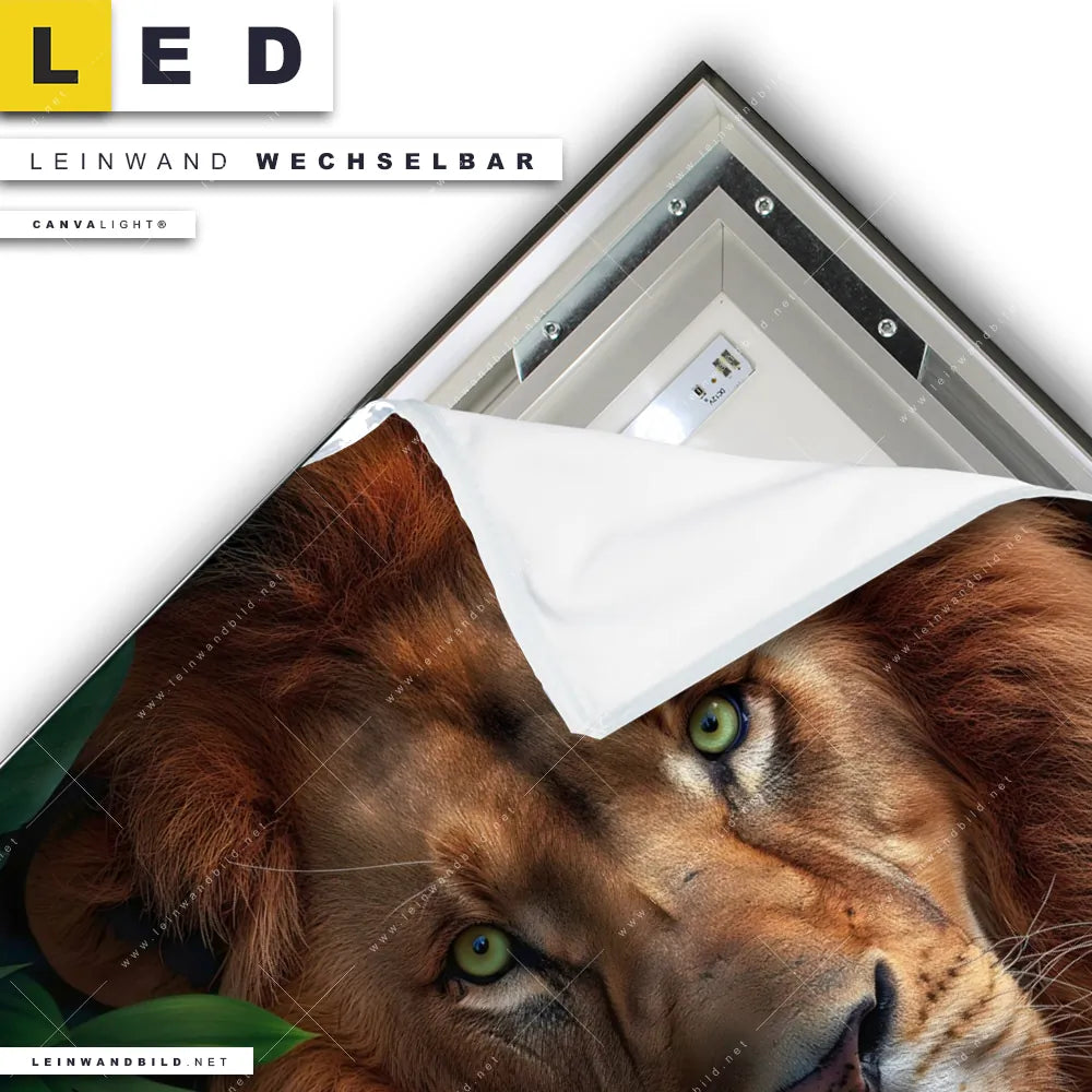 Du konfigurierst Dein individuelles LED Leinwandbild Canvalight® TEX | Löwe im grünen Regenwald | Quadrat und wir produzieren es NEU für Dich. Unsere Tierwelt, Blumen - Botanik LED Bilder mit wechselbarer Textil-Leinwand sind KEINE Lagerware. Du bist Dir unsicher, welches Motiv oder Format das richtige für dein individuelles Canvalight® Leuchtbild ist, dann helfen wir dir gerne weiter und beraten dich!
