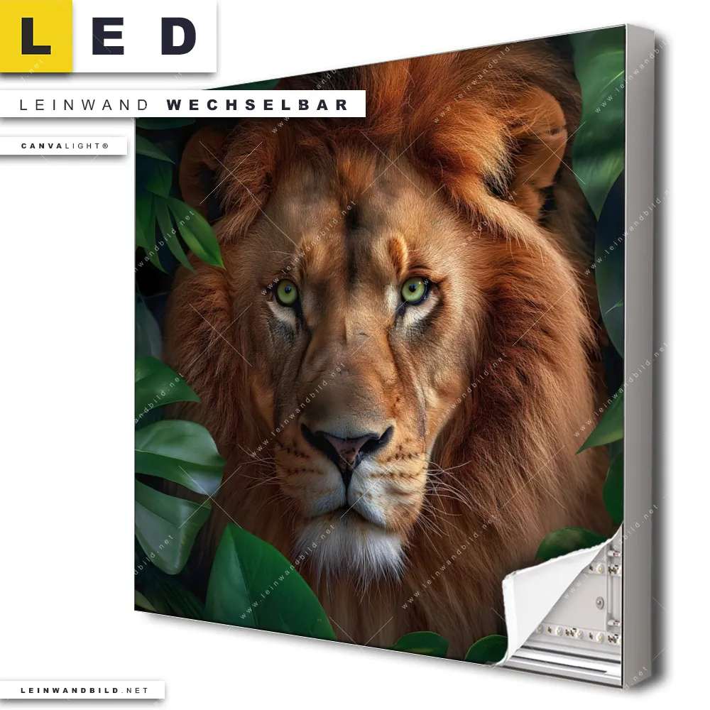 LED Leinwandbild Canvalight® TEX | Löwe im grünen Regenwald | Quadrat