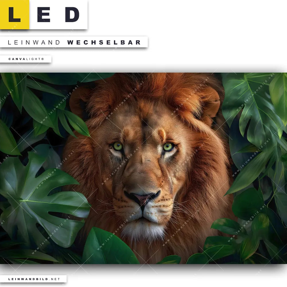 Dann sollte das LED Leinwandbild Canvalight® TEX | Löwe im grünen Regenwald | Querformat den Weg zu Dir finden. Das stufenlos dimmbare Leinwandbild Löwe mit grünen Augen im steckerfertigen Leuchtrahmen mit Fernbedienung und optionaler Farbtemperatursteuerung fügt sich als Eye-Catcher harmonisch in jedes Büro - Kanzlei, Wohnzimmer - Schlafzimmer, Flur - Eingangsbereich Raumkonzept ein.