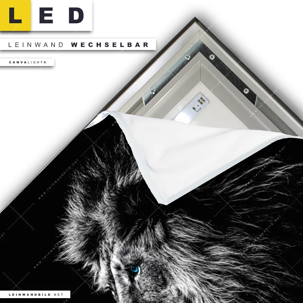 Du konfigurierst Dein individuelles LED Leinwandbild Canvalight® TEX | Löwe mit blauen Augen | Querformat und wir produzieren es NEU für Dich. Unsere Tierwelt LED Bilder mit wechselbarer Textil-Leinwand sind KEINE Lagerware. Du bist Dir unsicher, welches Motiv oder Format das richtige für dein individuelles Canvalight® Leuchtbild ist, dann helfen wir dir gerne weiter und beraten dich!