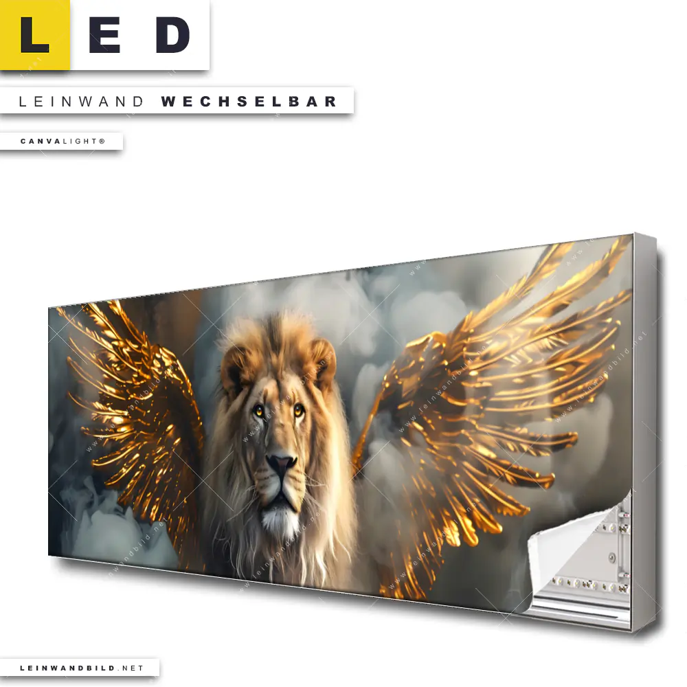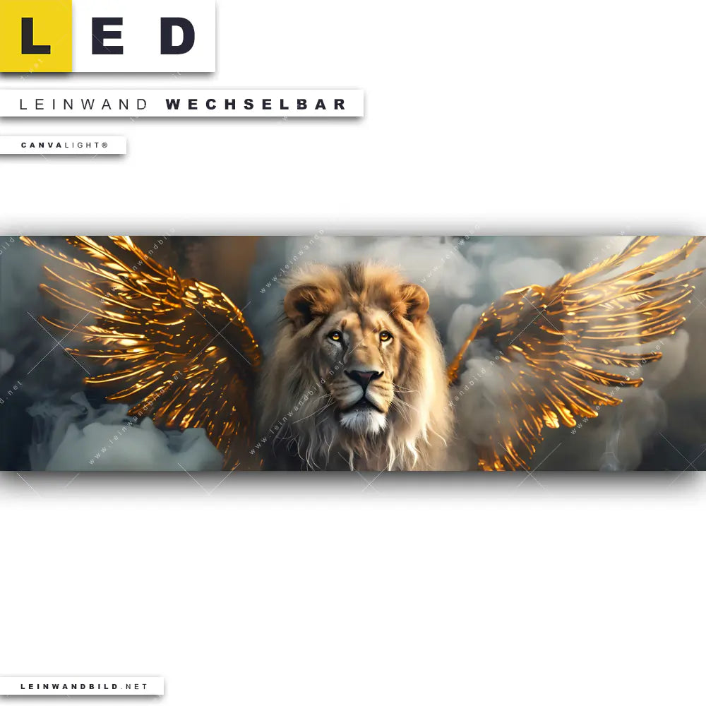 LED Leinwandbild Canvalight® TEX | Löwe mit goldenen Flügeln | Panorama