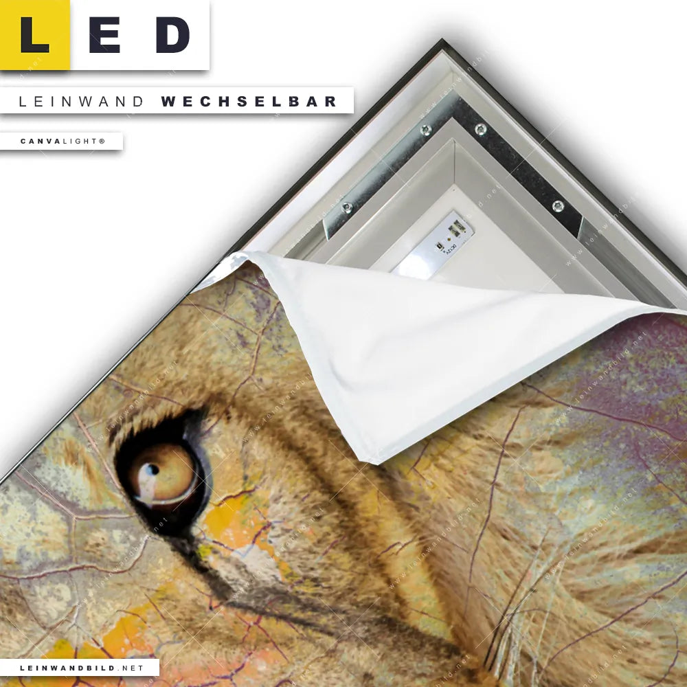 Du konfigurierst Dein individuelles LED Leinwandbild Canvalight® TEX | Löwe | Querformat und wir produzieren es NEU für Dich. Unsere Tierwelt LED Bilder mit wechselbarer Textil-Leinwand sind KEINE Lagerware. Du bist Dir unsicher, welches Motiv oder Format das richtige für dein individuelles Canvalight® Leuchtbild ist, dann helfen wir dir gerne weiter und beraten dich!