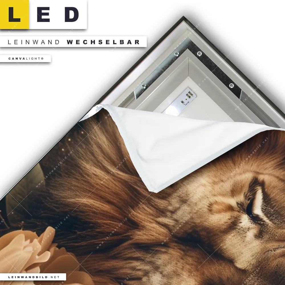 Du bist auf der Suche nach einem Tierwelt, Blumen - Botanik LED Leinwandbild im Hochformat? Begriffe wie Pflanze, Natur, Nahaufnahme, Raubkatze, Löwe, Blumen, Blüten haben Dich auf der Suche nach Deinem neuen XXL LED Wandbild mit wechselbarer Leinwand inspiriert? Farben wie Braun, Beige, Rosa dürfen auf Deinem neuen Leinwand-LED-Bild nicht fehlen und Leuchtbilder im Floral, Modern Art Stil passen perfekt zu Deinem Einrichtungsstil?