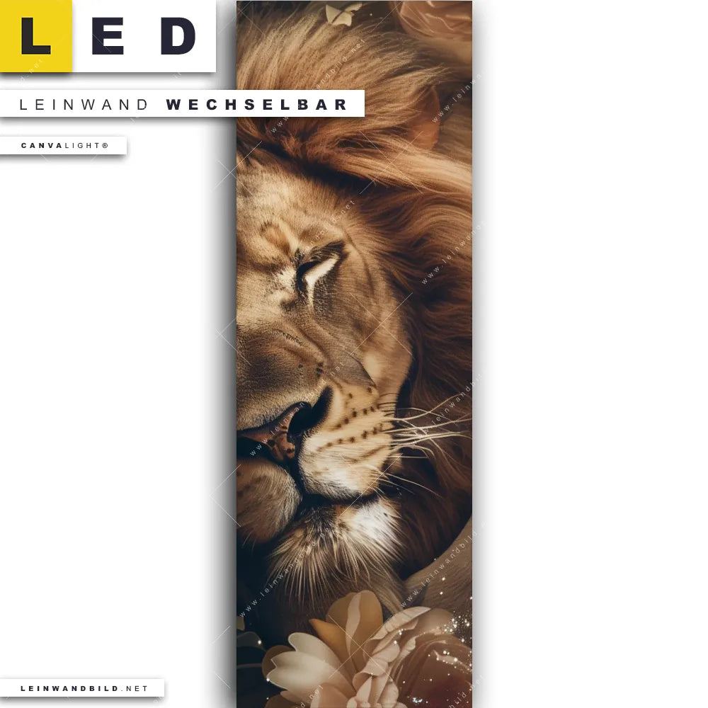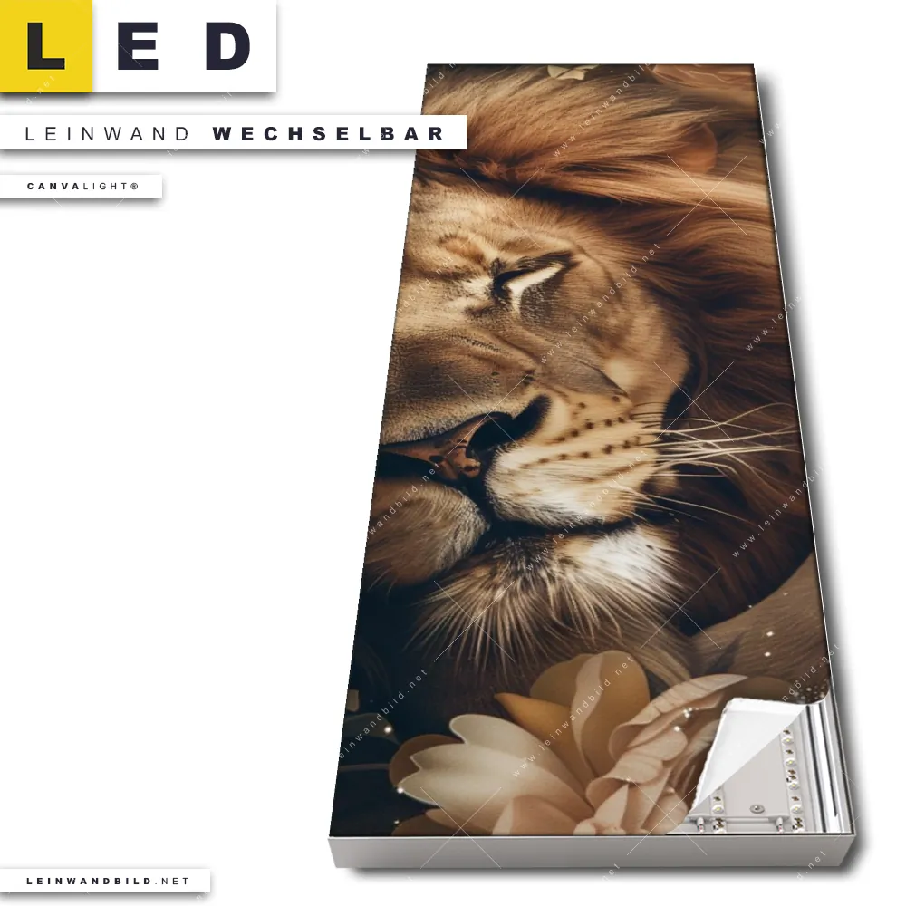 LED Leinwandbild Canvalight® TEX | Löwe schläft in Blüten | Schmal