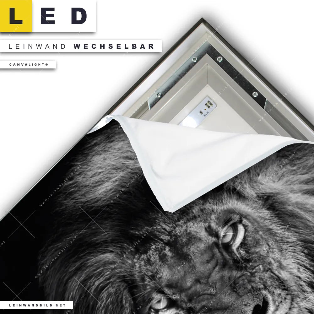 Du konfigurierst Dein individuelles LED Leinwandbild Canvalight® TEX | Löwe Schwarzweiß | Hochformat und wir produzieren es NEU für Dich. Unsere Tierwelt LED Bilder mit wechselbarer Textil-Leinwand sind KEINE Lagerware. Du bist Dir unsicher, welches Motiv oder Format das richtige für dein individuelles Canvalight® Leuchtbild ist, dann helfen wir dir gerne weiter und beraten dich!