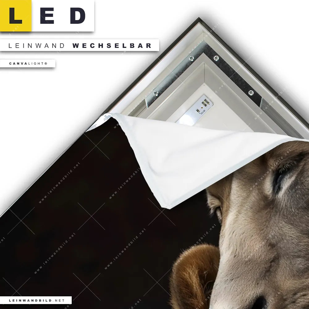 Du konfigurierst Dein individuelles LED Leinwandbild Canvalight® TEX | Löwen - Stärke und Zärtlichkeit | Hochformat und wir produzieren es NEU für Dich. Unsere Tierwelt LED Bilder mit wechselbarer Textil-Leinwand sind KEINE Lagerware. Du bist Dir unsicher, welches Motiv oder Format das richtige für dein individuelles Canvalight® Leuchtbild ist, dann helfen wir dir gerne weiter und beraten dich!