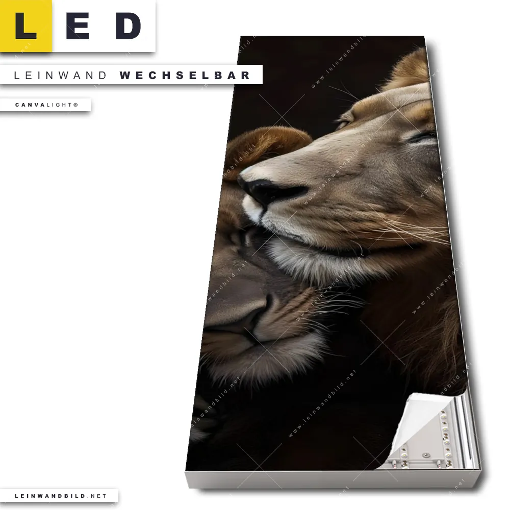 Du konfigurierst Dein individuelles LED Leinwandbild Canvalight® TEX | Löwen - Stärke und Zärtlichkeit | Schmal und wir produzieren es NEU für Dich. Unsere Tierwelt LED Bilder mit wechselbarer Textil-Leinwand sind KEINE Lagerware. Du bist Dir unsicher, welches Motiv oder Format das richtige für dein individuelles Canvalight® Leuchtbild ist, dann helfen wir dir gerne weiter und beraten dich!