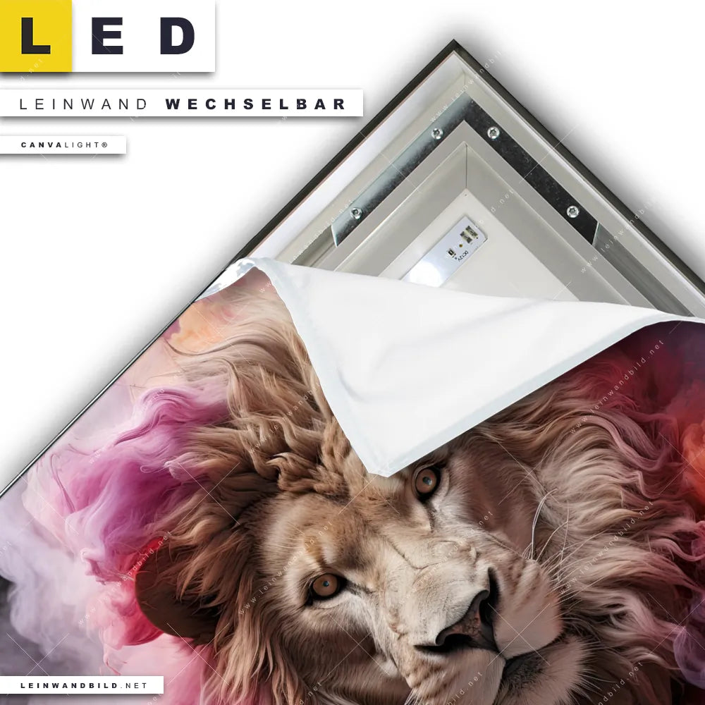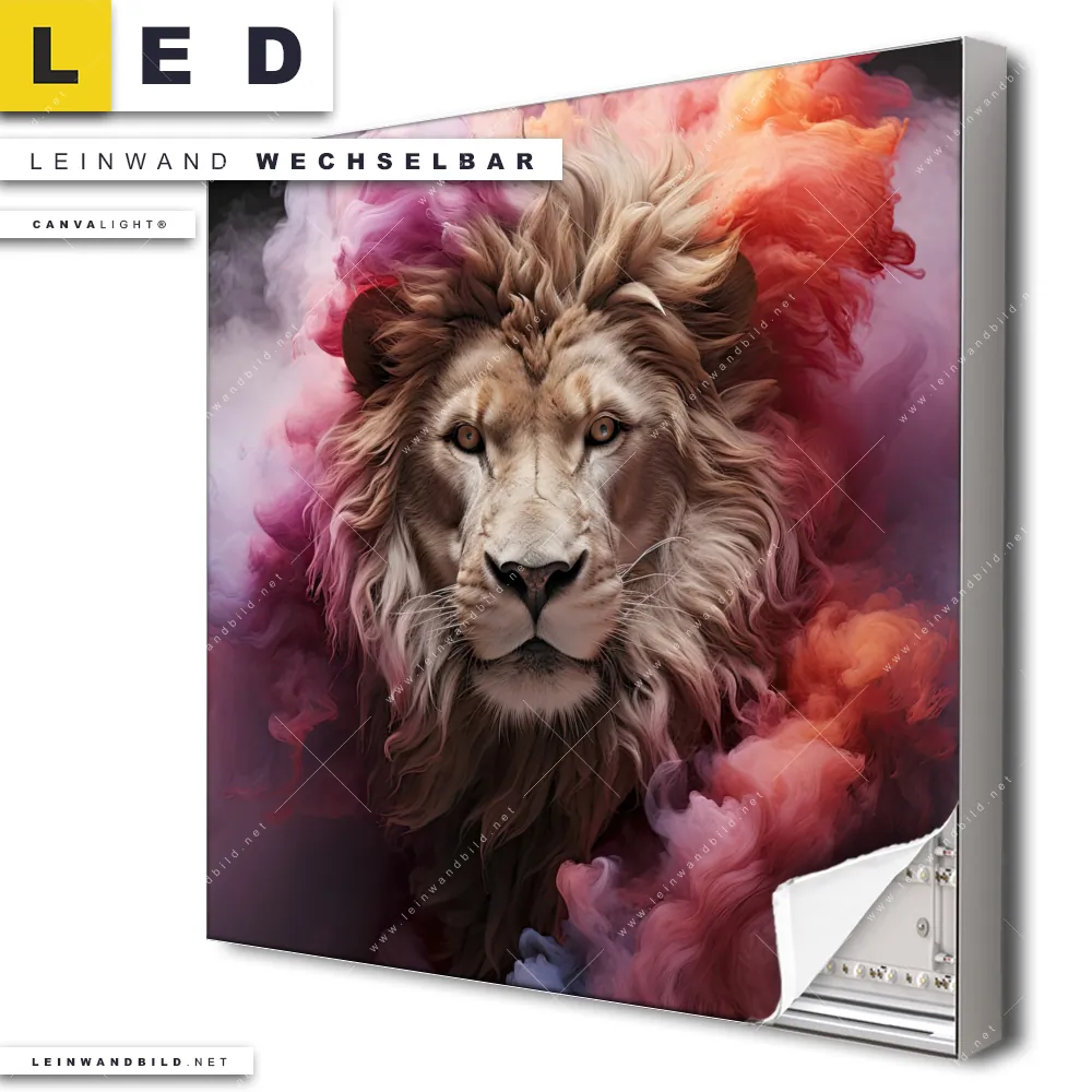 Du konfigurierst Dein individuelles LED Leinwandbild Canvalight® TEX | Löwengesicht in buntem Rauch | Quadrat und wir produzieren es NEU für Dich. Unsere Tierwelt LED Bilder mit wechselbarer Textil-Leinwand sind KEINE Lagerware. Du bist Dir unsicher, welches Motiv oder Format das richtige für dein individuelles Canvalight® Leuchtbild ist, dann helfen wir dir gerne weiter und beraten dich!