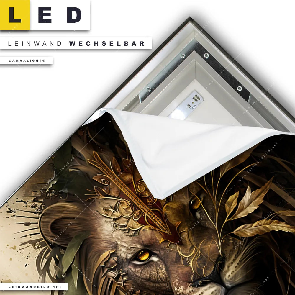 Du konfigurierst Dein individuelles LED Leinwandbild Canvalight® TEX | Löwenkopf mit Krone | Quadrat und wir produzieren es NEU für Dich. Unsere Tierwelt LED Bilder mit wechselbarer Textil-Leinwand sind KEINE Lagerware. Du bist Dir unsicher, welches Motiv oder Format das richtige für dein individuelles Canvalight® Leuchtbild ist, dann helfen wir dir gerne weiter und beraten dich!