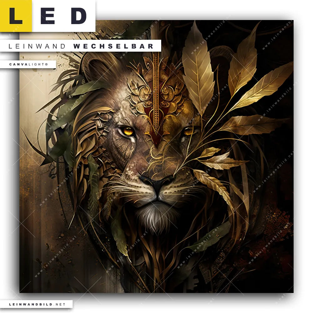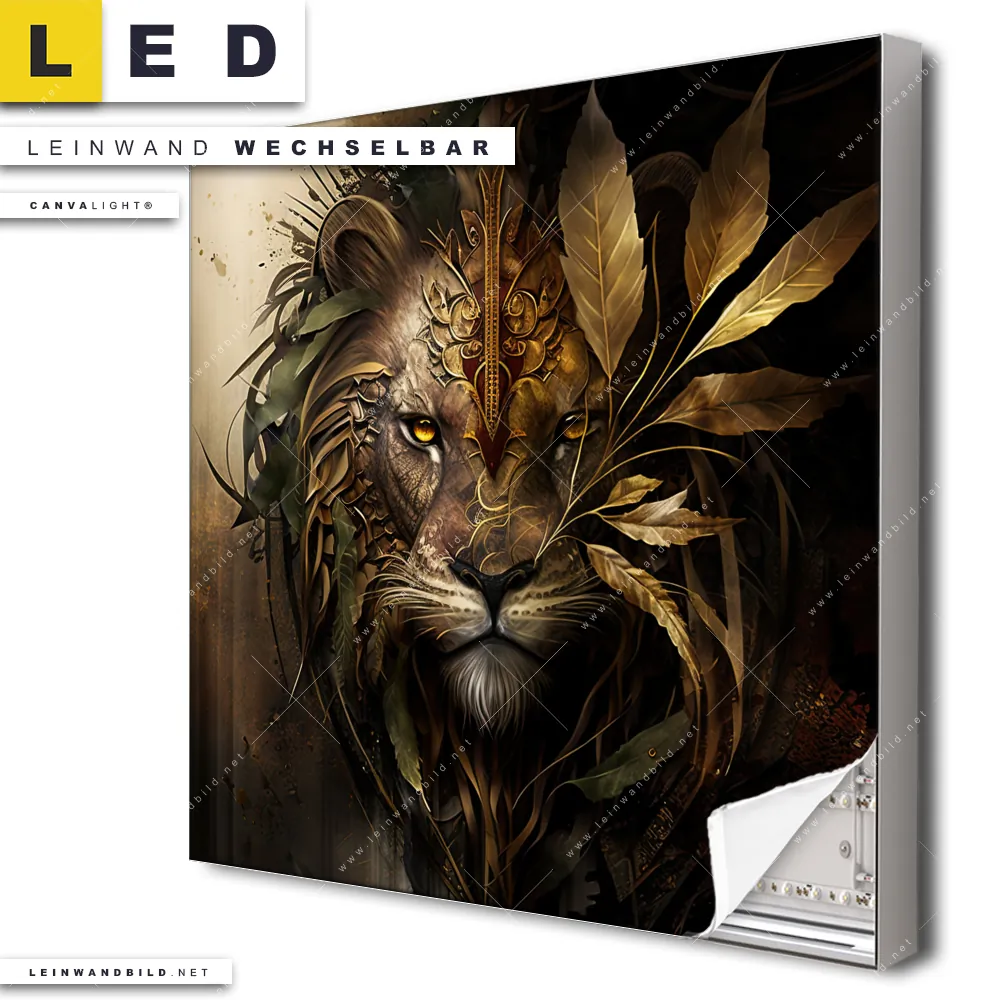 Du bist auf der Suche nach einem Tierwelt LED Leinwandbild im Quadratischen Format? Begriffe wie Raubkatze, Löwe, Afrika, Dschungel, Blätter, Porträt haben Dich auf der Suche nach Deinem neuen XXL LED Wandbild mit wechselbarer Leinwand inspiriert? Farben wie Schwarz, Gold, Beige dürfen auf Deinem neuen Leinwand-LED-Bild nicht fehlen und Leuchtbilder im Surreal - Fantasy, Modern Art Stil passen perfekt zu Deinem Einrichtungsstil?