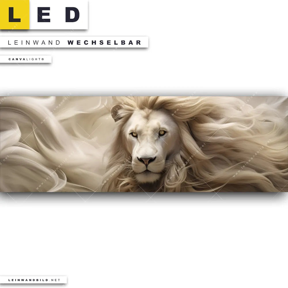Dann sollte das LED Leinwandbild Canvalight® TEX | Löwenkopf mit weißer Mähne | Panorama den Weg zu Dir finden. Das stufenlos dimmbare Leinwandbild Weißer mystischer Löwe im steckerfertigen Leuchtrahmen mit Fernbedienung und optionaler Farbtemperatursteuerung fügt sich als Eye-Catcher harmonisch in jedes Bar - Gastronomie, Wohnzimmer - Schlafzimmer, Büro - Kanzlei, Flur - Eingangsbereich Raumkonzept ein.