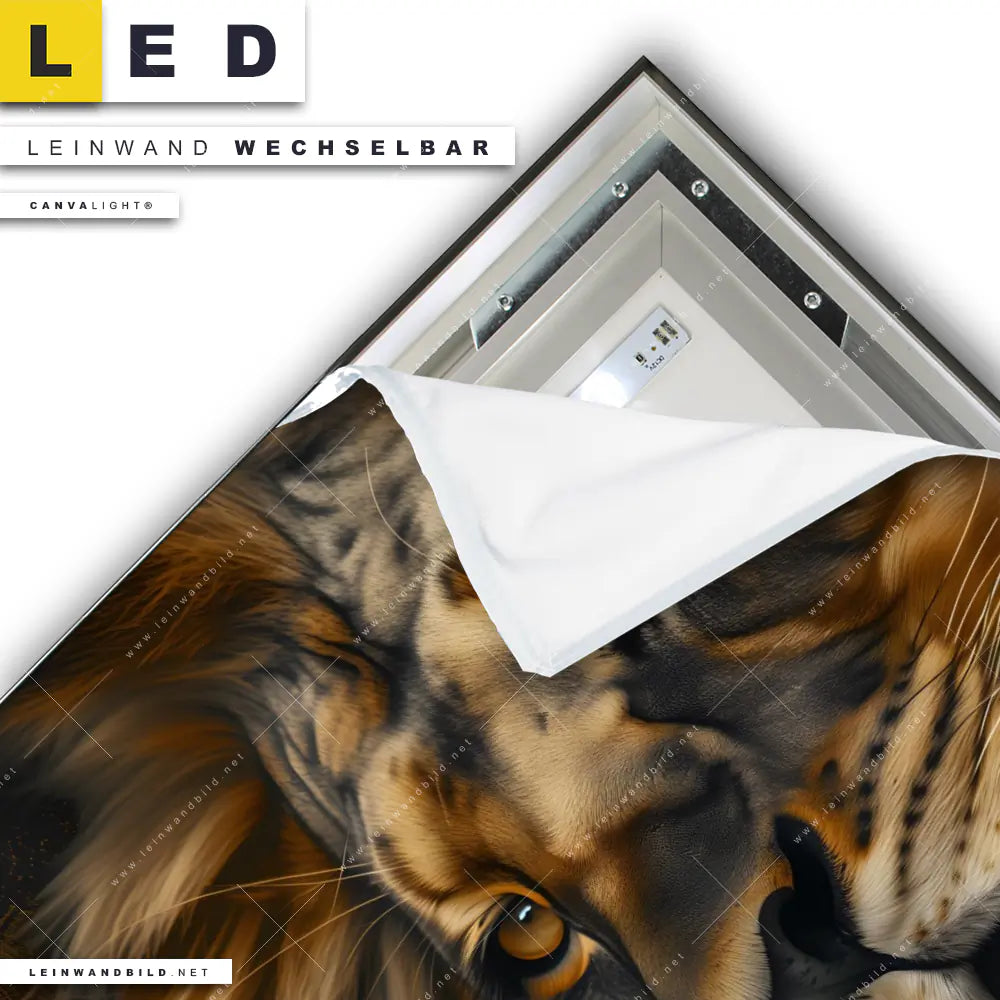 Du konfigurierst Dein individuelles LED Leinwandbild Canvalight® TEX | Löwenportrait: Kraft und Eleganz | Quadrat und wir produzieren es NEU für Dich. Unsere Tierwelt LED Bilder mit wechselbarer Textil-Leinwand sind KEINE Lagerware. Du bist Dir unsicher, welches Motiv oder Format das richtige für dein individuelles Canvalight® Leuchtbild ist, dann helfen wir dir gerne weiter und beraten dich!