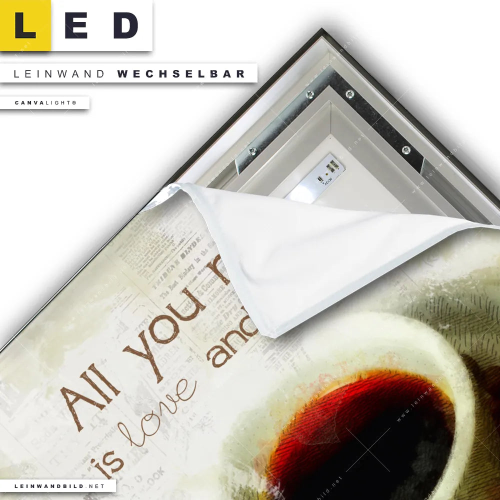 Du konfigurierst Dein individuelles LED Leinwandbild Canvalight® TEX | Love & Coffee | Quadrat und wir produzieren es NEU für Dich. Unsere Essen - Trinken LED Bilder mit wechselbarer Textil-Leinwand sind KEINE Lagerware. Du bist Dir unsicher, welches Motiv oder Format das richtige für dein individuelles Canvalight® Leuchtbild ist, dann helfen wir dir gerne weiter und beraten dich!