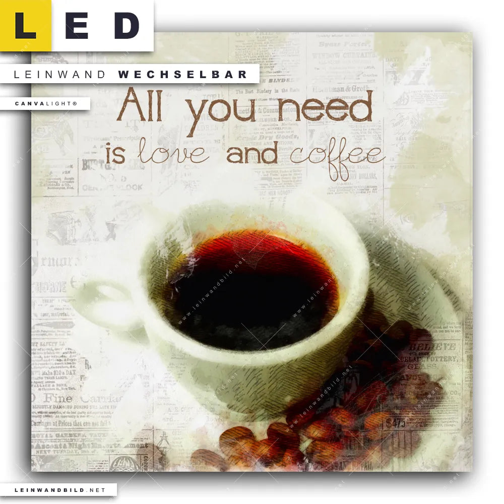Dann sollte das LED Leinwandbild Canvalight® TEX | Love & Coffee | Quadrat den Weg zu Dir finden. Das stufenlos dimmbare Leinwandbild All you need is love and coffee im steckerfertigen Leuchtrahmen mit Fernbedienung und optionaler Farbtemperatursteuerung fügt sich als Eye-Catcher harmonisch in jedes Küche - Esszimmer, Büro - Kanzlei, Bar - Gastronomie, Arzt - Praxis, Friseur - Beauty Raumkonzept ein.