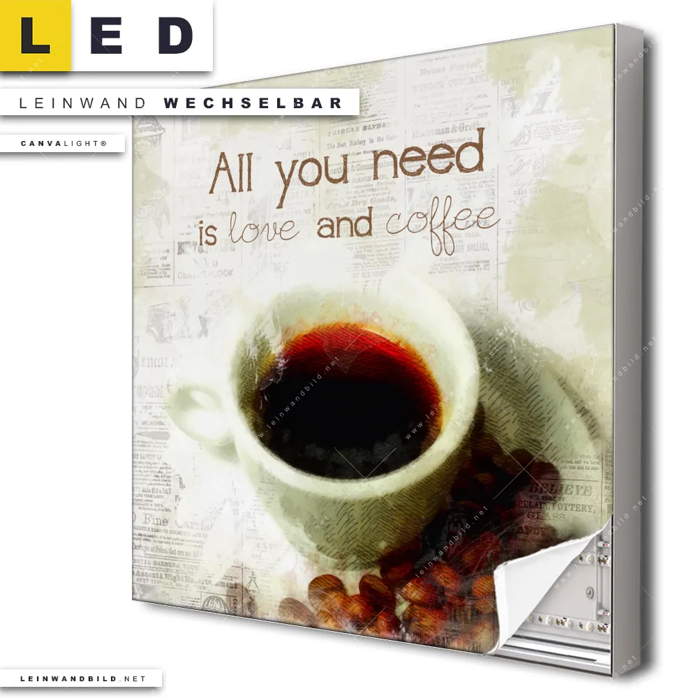 Du bist auf der Suche nach einem Essen - Trinken LED Leinwandbild im Quadratischen Format? Begriffe wie Kaffee, Coffee, Motivation, Küche, Kaffebohnen, Spruch, Liebe haben Dich auf der Suche nach Deinem neuen XXL LED Wandbild mit wechselbarer Leinwand inspiriert? Farben wie Braun, Beige dürfen auf Deinem neuen Leinwand-LED-Bild nicht fehlen und Leuchtbilder im Retro - Vintage, Mixed Media Stil passen perfekt zu Deinem Einrichtungsstil?