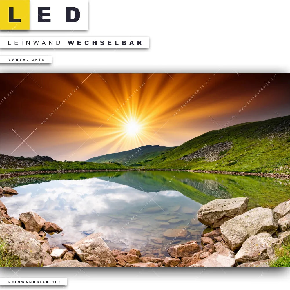 Du bist auf der Suche nach einem Landschaften LED Leinwandbild im Querformat? Begriffe wie Landschaft, Natur, Stille, See, Wasser, Berge, Sonnenuntergang, Sonnenaufgang, Sonne, Gebirge haben Dich auf der Suche nach Deinem neuen XXL LED Wandbild mit wechselbarer Leinwand inspiriert? Farben wie Orange, Grün dürfen auf Deinem neuen breiten Leinwand-LED-Bild nicht fehlen und Leuchtbilder im Natürlich - Realistisch, Mixed Media Stil passen perfekt zu Deinem Einrichtungsstil?
