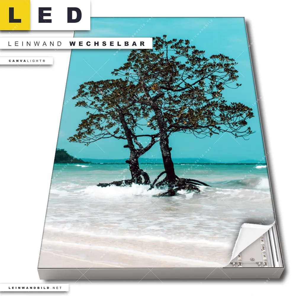 Dann sollte das LED Leinwandbild Canvalight® TEX | Mangrovenbaum im Wasser | Hochformat den Weg zu Dir finden. Das stufenlos dimmbare Leinwandbild Baum am Sandstrand im steckerfertigen Leuchtrahmen mit Fernbedienung und optionaler Farbtemperatursteuerung fügt sich als Eye-Catcher harmonisch in jedes Bar - Gastronomie, Büro - Kanzlei, Wohnzimmer - Schlafzimmer Raumkonzept ein.