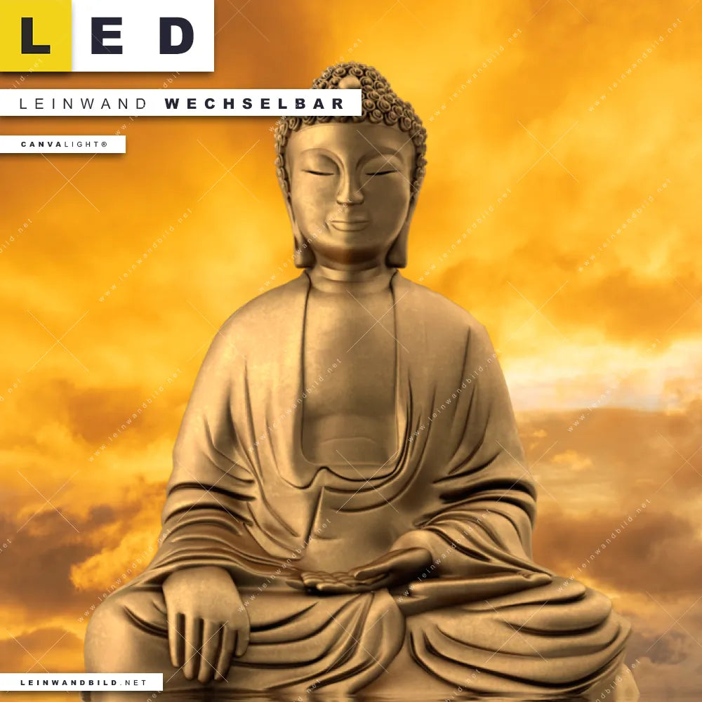 Du bist auf der Suche nach einem Buddha - Feng Shui LED Leinwandbild im Quadratischen Format? Begriffe wie Buddha, Buddhismus, Religion, Feng Shui, Zen, Meditation, Licht, Erleuchtung, Sonnenlicht, Sonnenuntergang, Spiegelung, Skulptur haben Dich auf der Suche nach Deinem neuen XXL LED Wandbild mit wechselbarer Leinwand inspiriert? Farben wie Gold, Orange, Beige dürfen auf Deinem neuen Leinwand-LED-Bild nicht fehlen und Leuchtbilder im Modern Art Stil passen perfekt zu Deinem Einrichtungsstil?