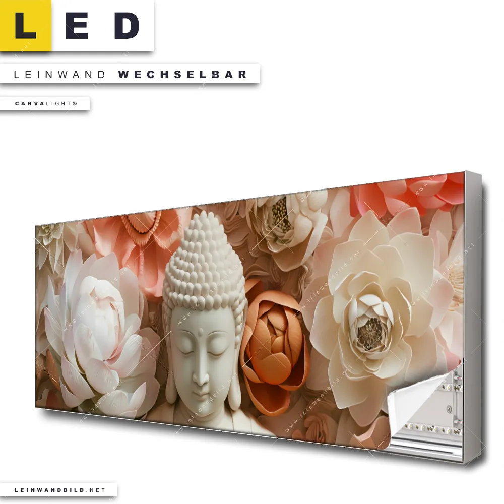 Du bist auf der Suche nach einem Buddha - Feng Shui, Blumen - Botanik LED Leinwandbild im Panorama-Format? Begriffe wie Statue, Buddha, Meditation, Buddhismus, Religion, Blumen, Spirituell haben Dich auf der Suche nach Deinem neuen XXL LED Wandbild mit wechselbarer Leinwand inspiriert? Farben wie Rosa, Weiss, Beige, Orange dürfen auf Deinem neuen extra breiten Leinwand-LED-Bild nicht fehlen und Leuchtbilder im Modern Art, Floral Stil passen perfekt zu Deinem Einrichtungsstil?