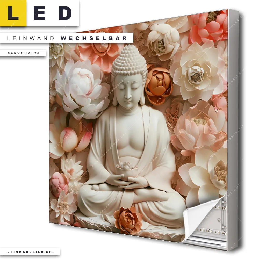 LED Leinwandbild Canvalight® TEX | Meditierender Buddha mit Blüten | Quadrat