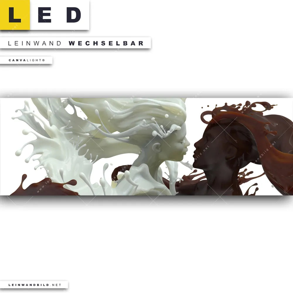Du bist auf der Suche nach einem Essen - Trinken LED Leinwandbild im Panorama-Format? Begriffe wie Kuss, Liebe, Milch, Schokolade, Flüssigkeit, Mann, Frau, Paar, Kaffee haben Dich auf der Suche nach Deinem neuen XXL LED Wandbild mit wechselbarer Leinwand inspiriert? Farben wie Weiss, Braun dürfen auf Deinem neuen extra breiten Leinwand-LED-Bild nicht fehlen und Leuchtbilder im Mixed Media, Modern Art Stil passen perfekt zu Deinem Einrichtungsstil?