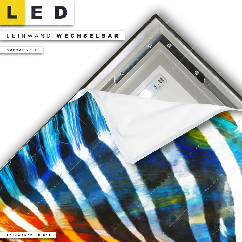 Du konfigurierst Dein individuelles LED Leinwandbild Canvalight® TEX | Modernes Buntes Zebra | Querformat und wir produzieren es NEU für Dich. Unsere Tierwelt LED Bilder mit wechselbarer Textil-Leinwand sind KEINE Lagerware. Du bist Dir unsicher, welches Motiv oder Format das richtige für dein individuelles Canvalight® Leuchtbild ist, dann helfen wir dir gerne weiter und beraten dich!