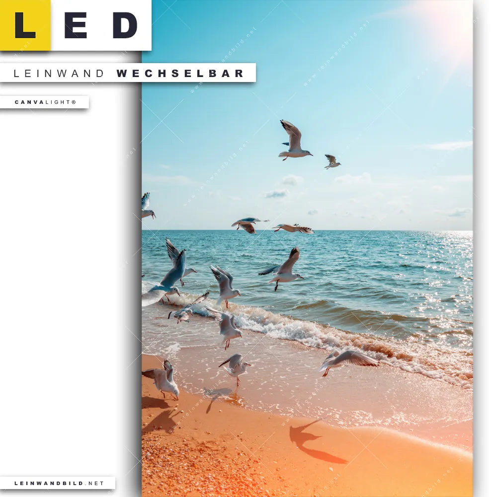 LED Leinwandbild Canvalight® TEX | Möwen am Strand | Hochformat