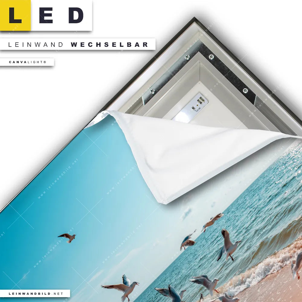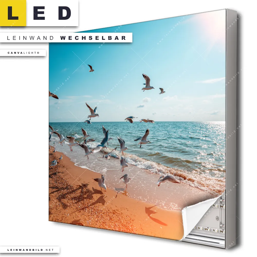 Du konfigurierst Dein individuelles LED Leinwandbild Canvalight® TEX | Möwen am Strand | Quadrat und wir produzieren es NEU für Dich. Unsere Landschaften, Strand - Meer LED Bilder mit wechselbarer Textil-Leinwand sind KEINE Lagerware. Du bist Dir unsicher, welches Motiv oder Format das richtige für dein individuelles Canvalight® Leuchtbild ist, dann helfen wir dir gerne weiter und beraten dich!
