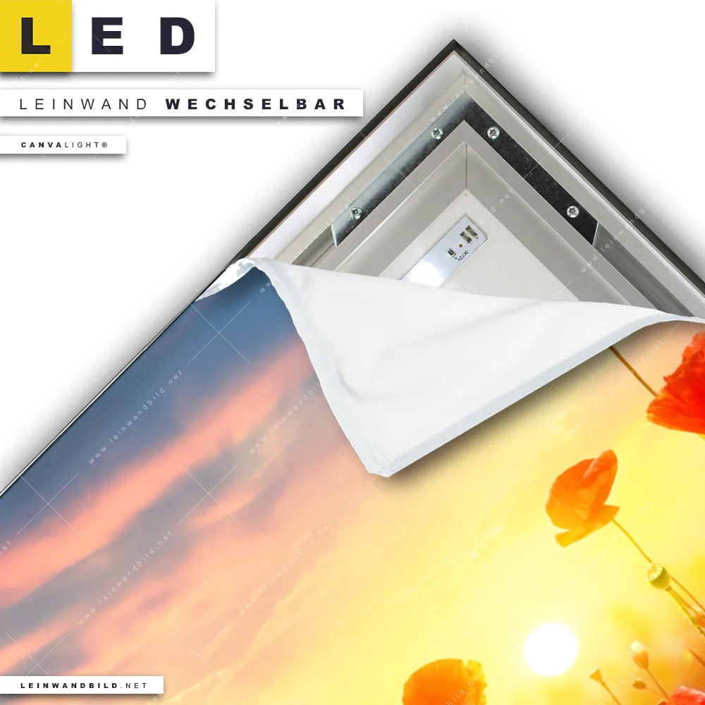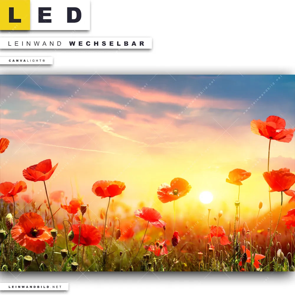 Du konfigurierst Dein individuelles LED Leinwandbild Canvalight® TEX | Mohnblumenfeld bei Sonnenuntergang | Querformat und wir produzieren es NEU für Dich. Unsere Landschaften, Blumen - Botanik LED Bilder mit wechselbarer Textil-Leinwand sind KEINE Lagerware. Du bist Dir unsicher, welches Motiv oder Format das richtige für dein individuelles Canvalight® Leuchtbild ist, dann helfen wir dir gerne weiter und beraten dich!