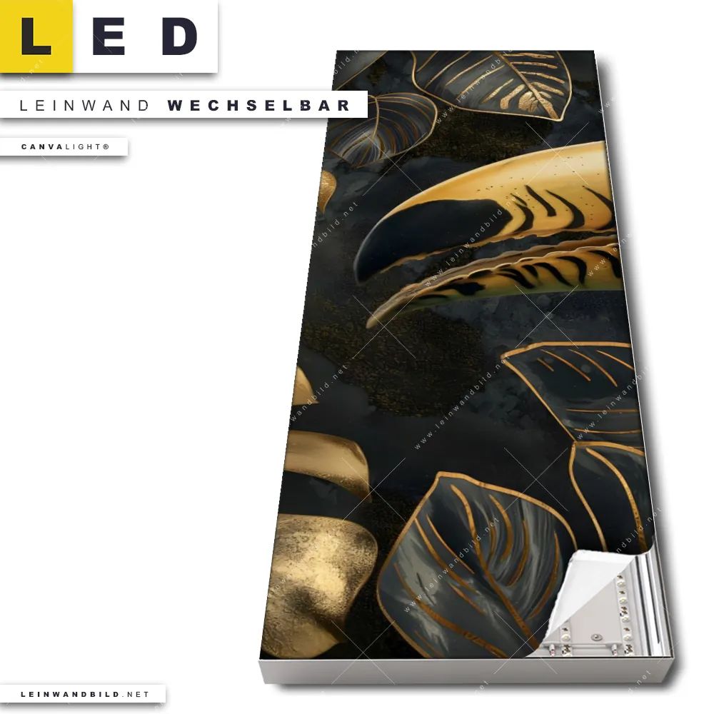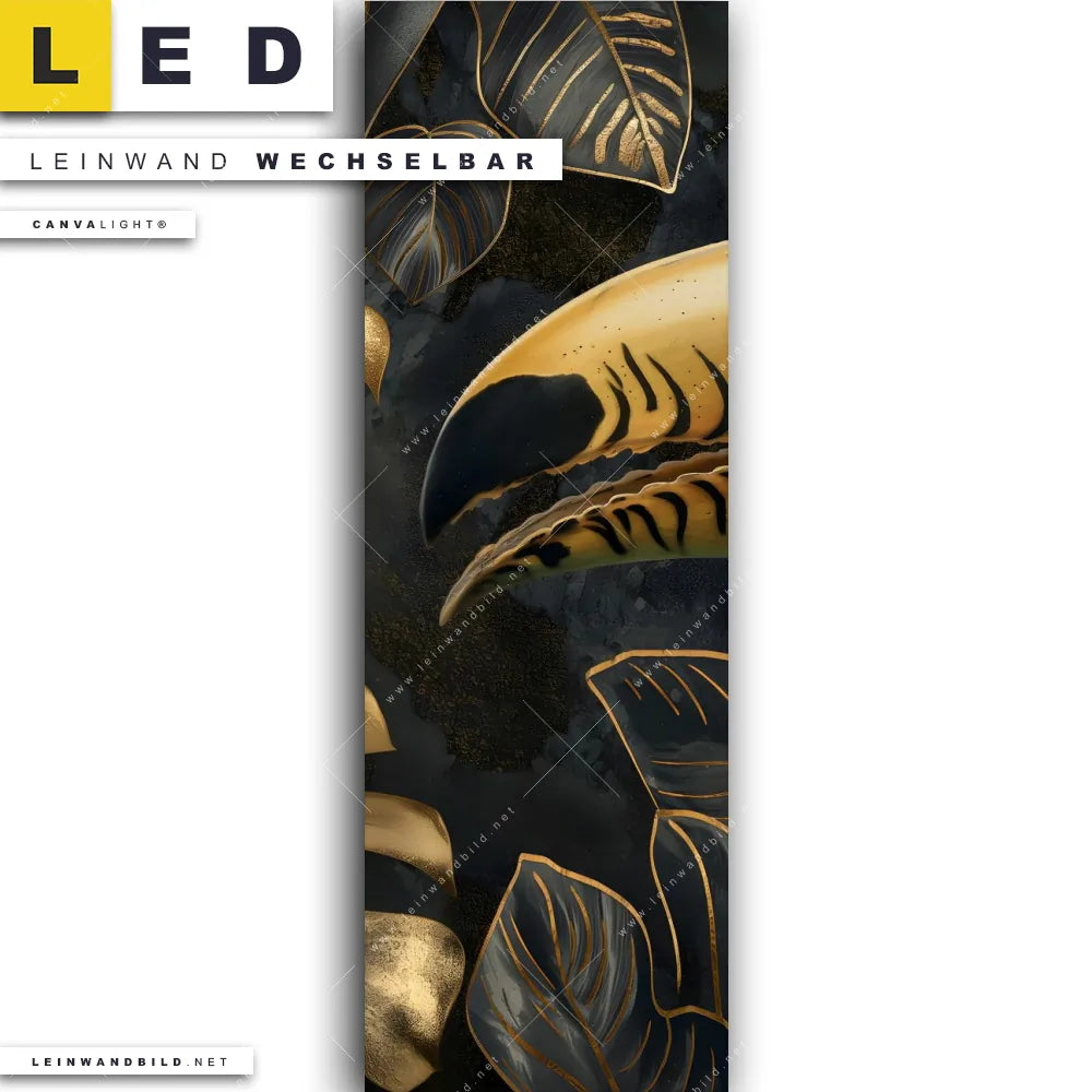 LED Leinwandbild Canvalight® TEX | Monstera und Tukan Gold | Schmal