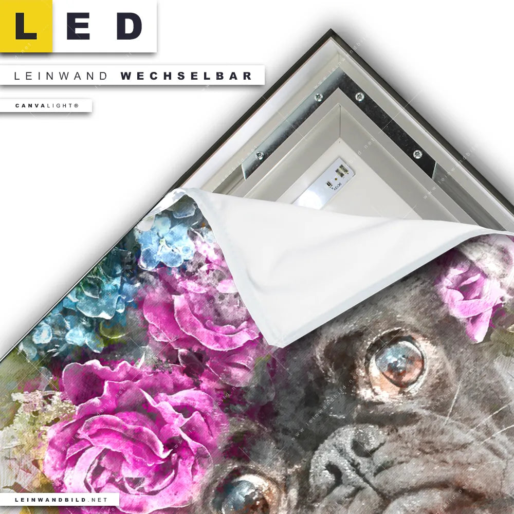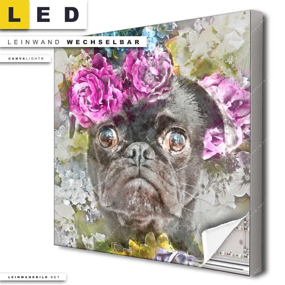 Du bist auf der Suche nach einem Tierwelt, Blumen - Botanik LED Leinwandbild im Quadratischen Format? Begriffe wie Tiere & Blumen, Mops, Hund, Tier, Blumen, Blüten haben Dich auf der Suche nach Deinem neuen XXL LED Wandbild mit wechselbarer Leinwand inspiriert? Farben wie Schwarz, Pink, Weiss, Blau, Gelb , Grau , Braun, Ocker dürfen auf Deinem neuen Leinwand-LED-Bild nicht fehlen und Leuchtbilder im Abstrakt, Grunge, Mixed Media, Modern Art, Floral Stil passen perfekt zu Deinem Einrichtungsstil?