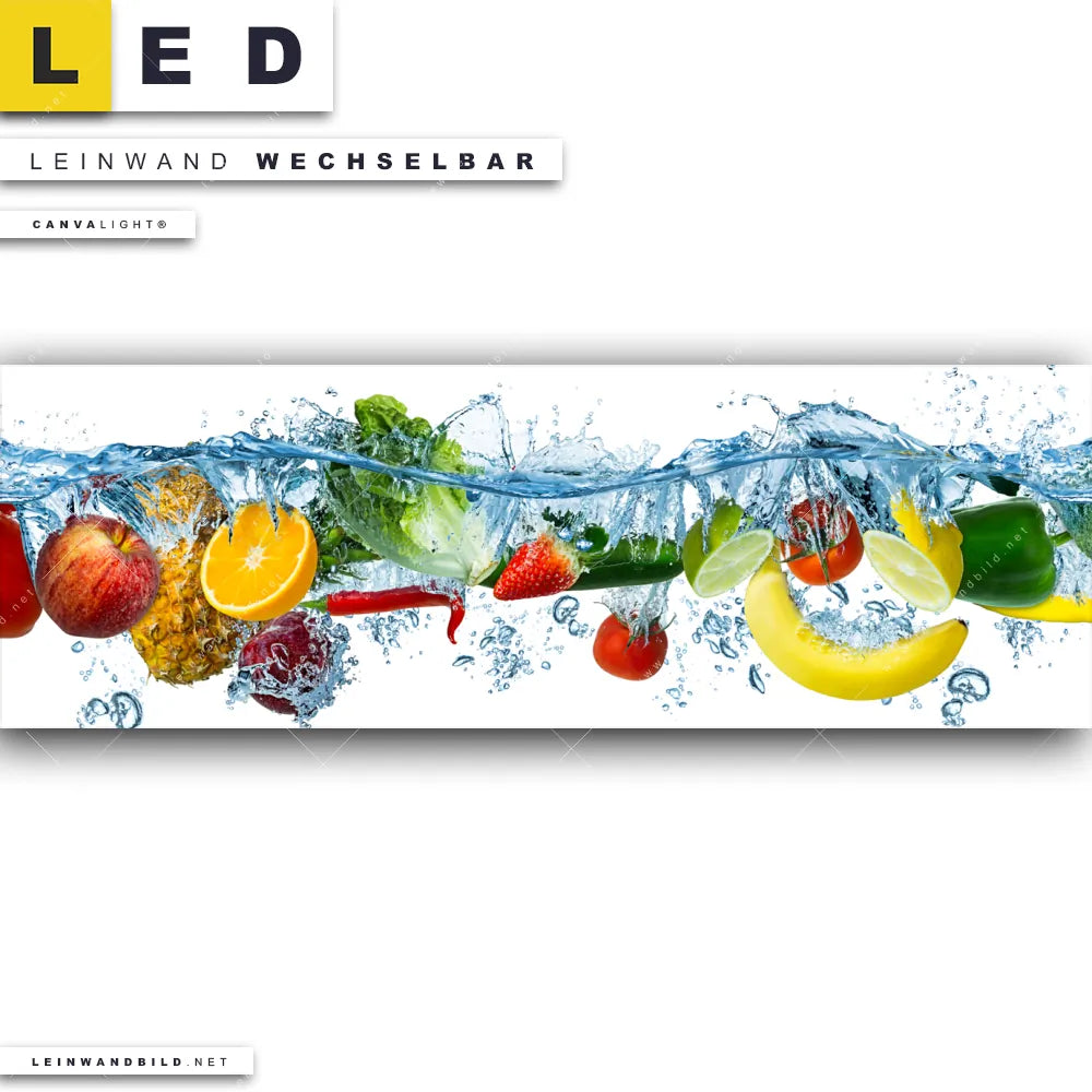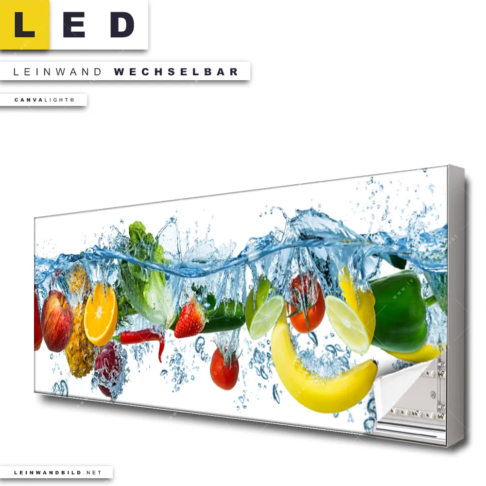 Du bist auf der Suche nach einem Essen - Trinken LED Leinwandbild im Panorama-Format? Begriffe wie Obst, Zitrusfrüchte, Früchte, frisch, spritzig, Spritzwasser, Wasser, Spritzer, Tropfen, Wassertropfen, Orange, Apfel, Zitrone, Gemüse haben Dich auf der Suche nach Deinem neuen XXL LED Wandbild mit wechselbarer Leinwand inspiriert? Farben wie Bunt, Weiss, Blau, Gelb , Grün, Hellblau, Hellgrün, Orange, Rot, Rosa dürfen auf Deinem neuen extra breiten Leinwand-LED-Bild nicht fehlen und Leuchtbilder im Mixed Media, Modern Art Stil passen perfekt zu Deinem Einrichtungsstil?