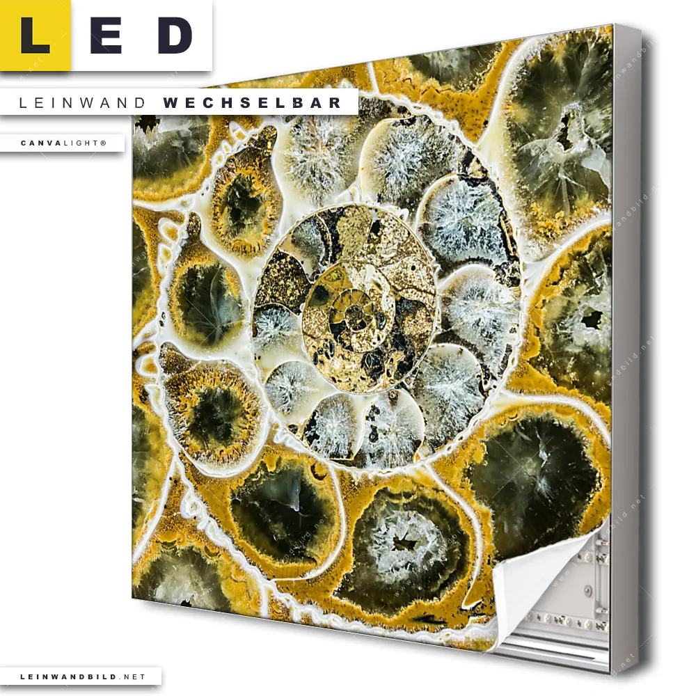 Du bist auf der Suche nach einem Muster - Texturen LED Leinwandbild im Quadratischen Format? Begriffe wie Muschel, Nahaufnahme, Makro, Fossil, close up, Spiarale haben Dich auf der Suche nach Deinem neuen XXL LED Wandbild mit wechselbarer Leinwand inspiriert? Farben wie Gold, Braun, Beige, Ocker, Hellblau dürfen auf Deinem neuen Leinwand-LED-Bild nicht fehlen und Leuchtbilder im Abstrakt, Modern Art, Geometrisch Stil passen perfekt zu Deinem Einrichtungsstil?