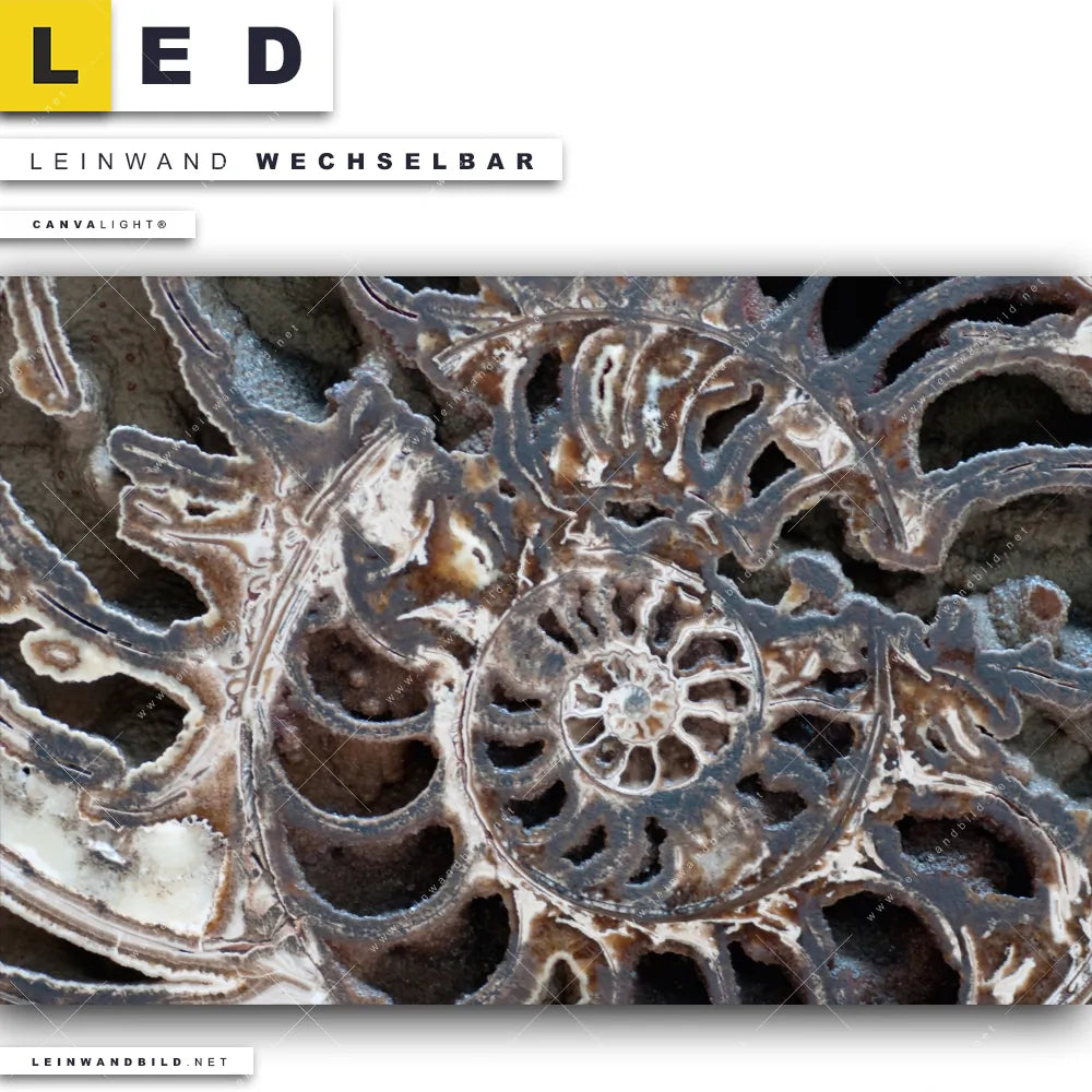 Begriffe wie Muschel, Nahaufnahme, Makro, Fossil, close up, Spirale, Rost, Rostoptik haben Dich auf der Suche nach Deinem neuen LED Wandbild mit beleuchteter Leinwand inspiriert? Dann sollte das LED Bild fossiles Gestein mit austauschbarer Textil-Fotoleinwand den Weg zu Dir finden.