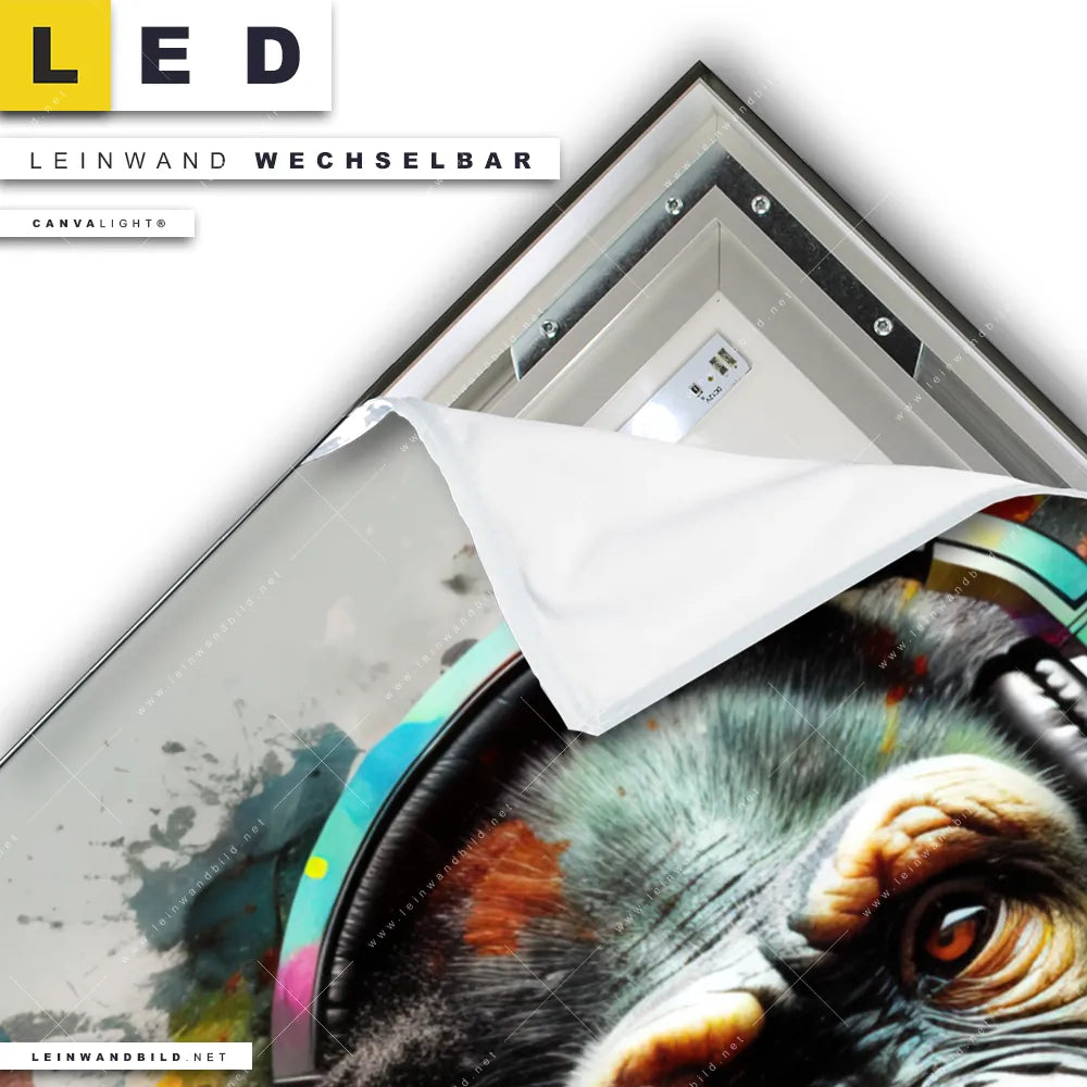 Du konfigurierst Dein individuelles LED Leinwandbild Canvalight® TEX | Musikalischer Affe | Hochformat und wir produzieren es NEU für Dich. Unsere Tierwelt LED Bilder mit wechselbarer Textil-Leinwand sind KEINE Lagerware. Du bist Dir unsicher, welches Motiv oder Format das richtige für dein individuelles Canvalight® Leuchtbild ist, dann helfen wir dir gerne weiter und beraten dich!