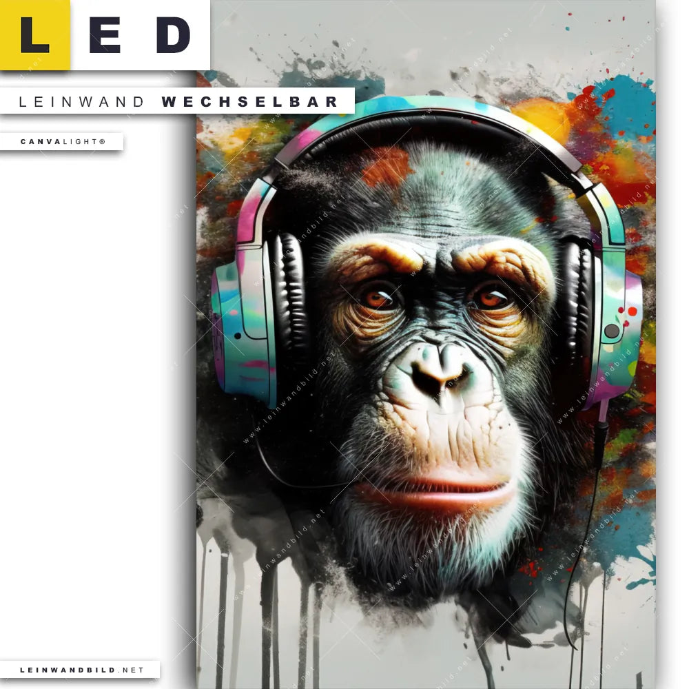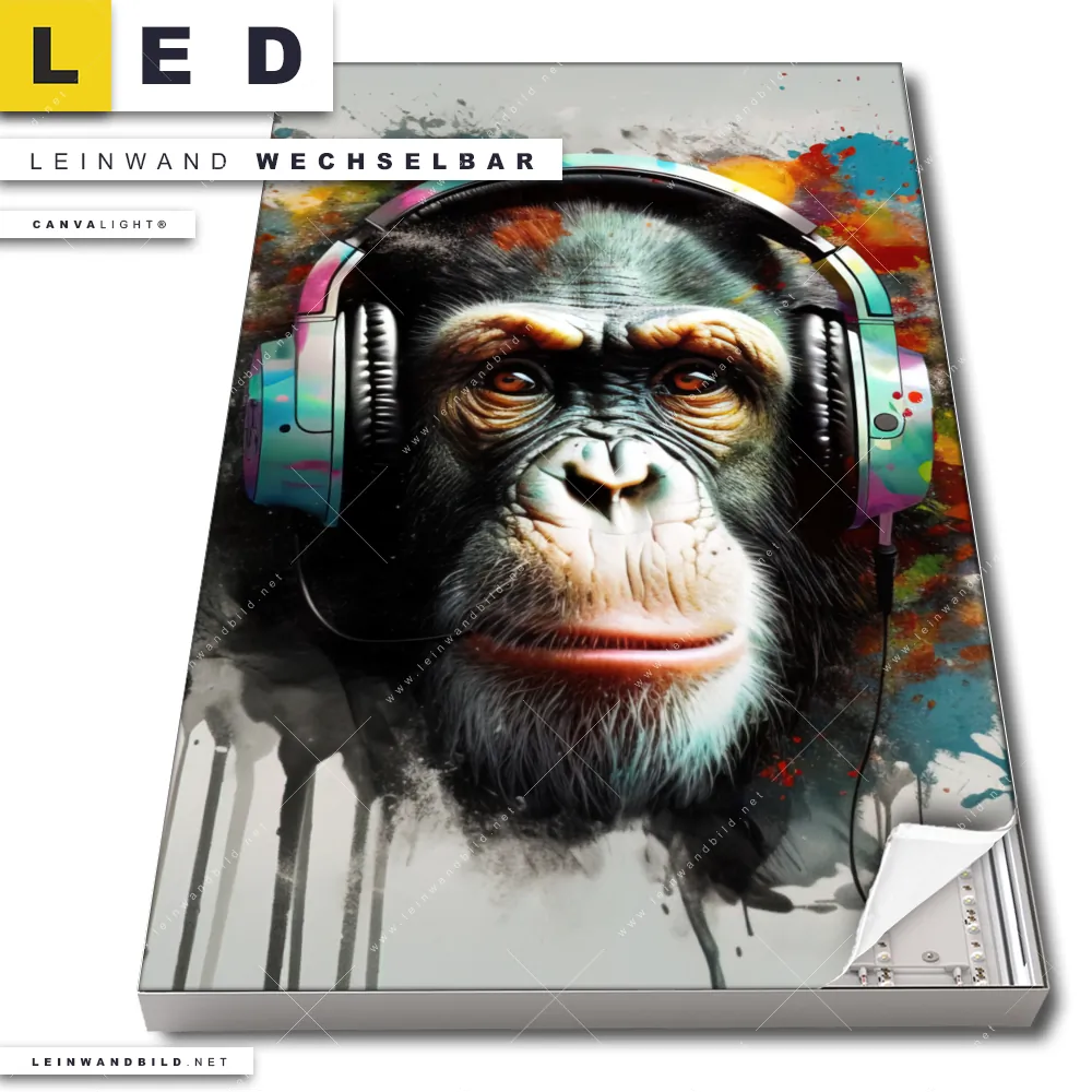 Du bist auf der Suche nach einem Tierwelt LED Leinwandbild im Hochformat? Begriffe wie Tier, Affe, Monkey, Chimpanzee, Schimpanse, Farbspritzer, Kopfhörer, Musik haben Dich auf der Suche nach Deinem neuen XXL LED Wandbild mit wechselbarer Leinwand inspiriert? Farben wie Bunt dürfen auf Deinem neuen Leinwand-LED-Bild nicht fehlen und Leuchtbilder im Modern Art, Pop Art Stil passen perfekt zu Deinem Einrichtungsstil?
