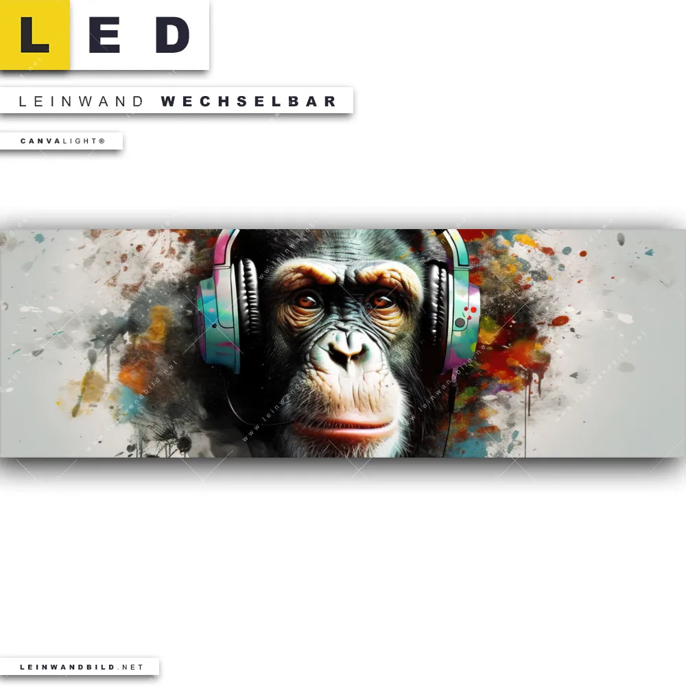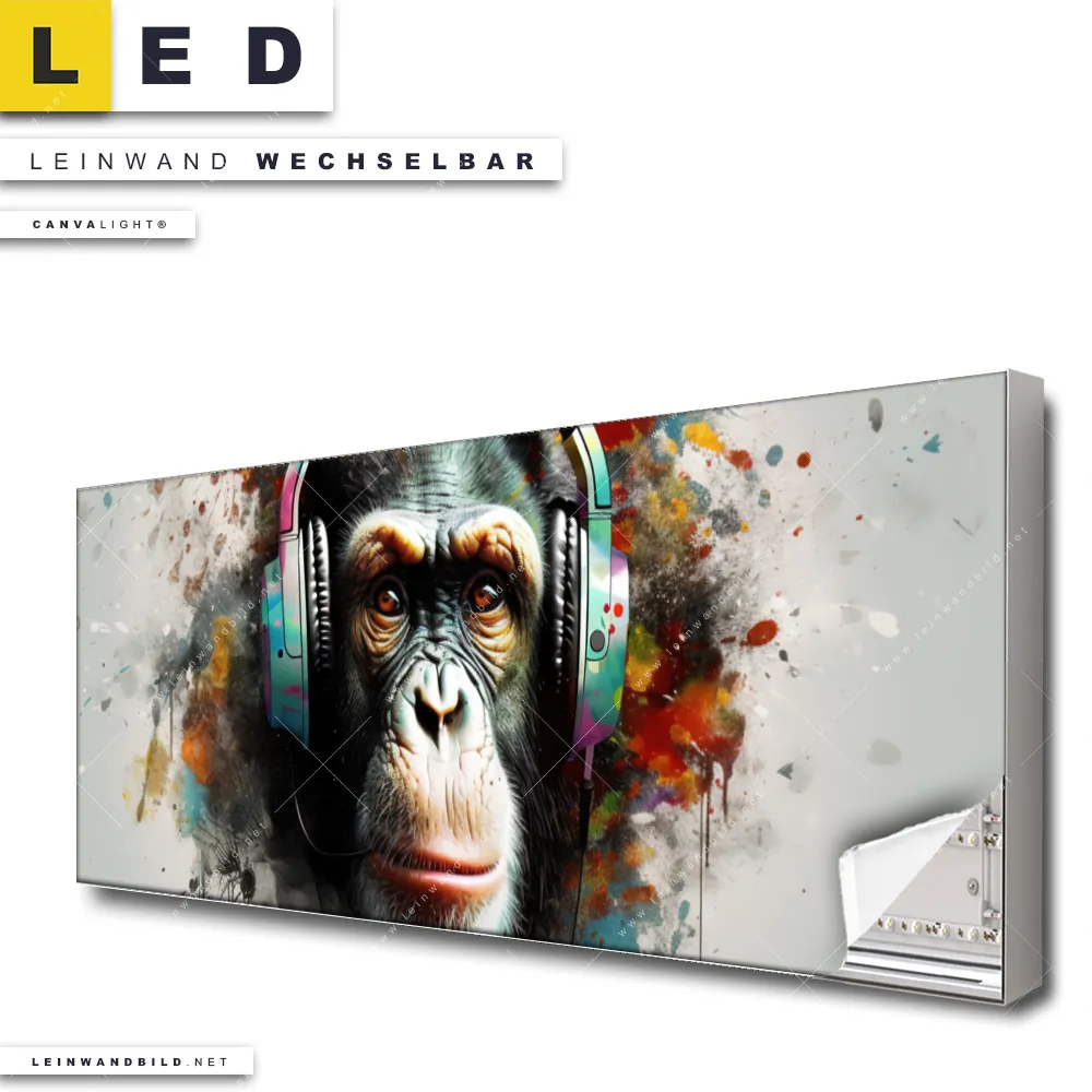 Du bist auf der Suche nach einem Tierwelt LED Leinwandbild im Panorama-Format? Begriffe wie Tier, Affe, Monkey, Chimpanzee, Schimpanse, Farbspritzer, Kopfhörer, Musik haben Dich auf der Suche nach Deinem neuen XXL LED Wandbild mit wechselbarer Leinwand inspiriert? Farben wie Bunt dürfen auf Deinem neuen extra breiten Leinwand-LED-Bild nicht fehlen und Leuchtbilder im Modern Art, Pop Art Stil passen perfekt zu Deinem Einrichtungsstil?