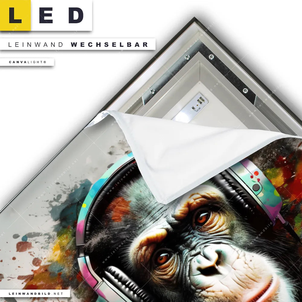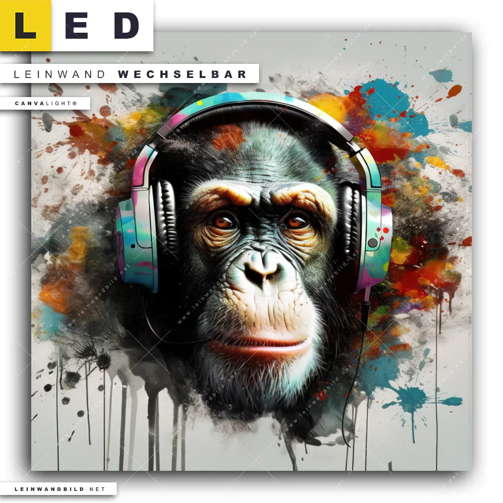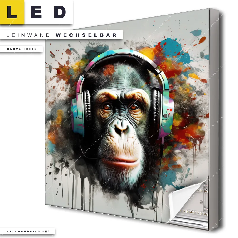 Du bist auf der Suche nach einem Tierwelt LED Leinwandbild im Quadratischen Format? Begriffe wie Tier, Affe, Monkey, Chimpanzee, Schimpanse, Farbspritzer, Kopfhörer, Musik haben Dich auf der Suche nach Deinem neuen XXL LED Wandbild mit wechselbarer Leinwand inspiriert? Farben wie Bunt dürfen auf Deinem neuen Leinwand-LED-Bild nicht fehlen und Leuchtbilder im Modern Art, Pop Art Stil passen perfekt zu Deinem Einrichtungsstil?