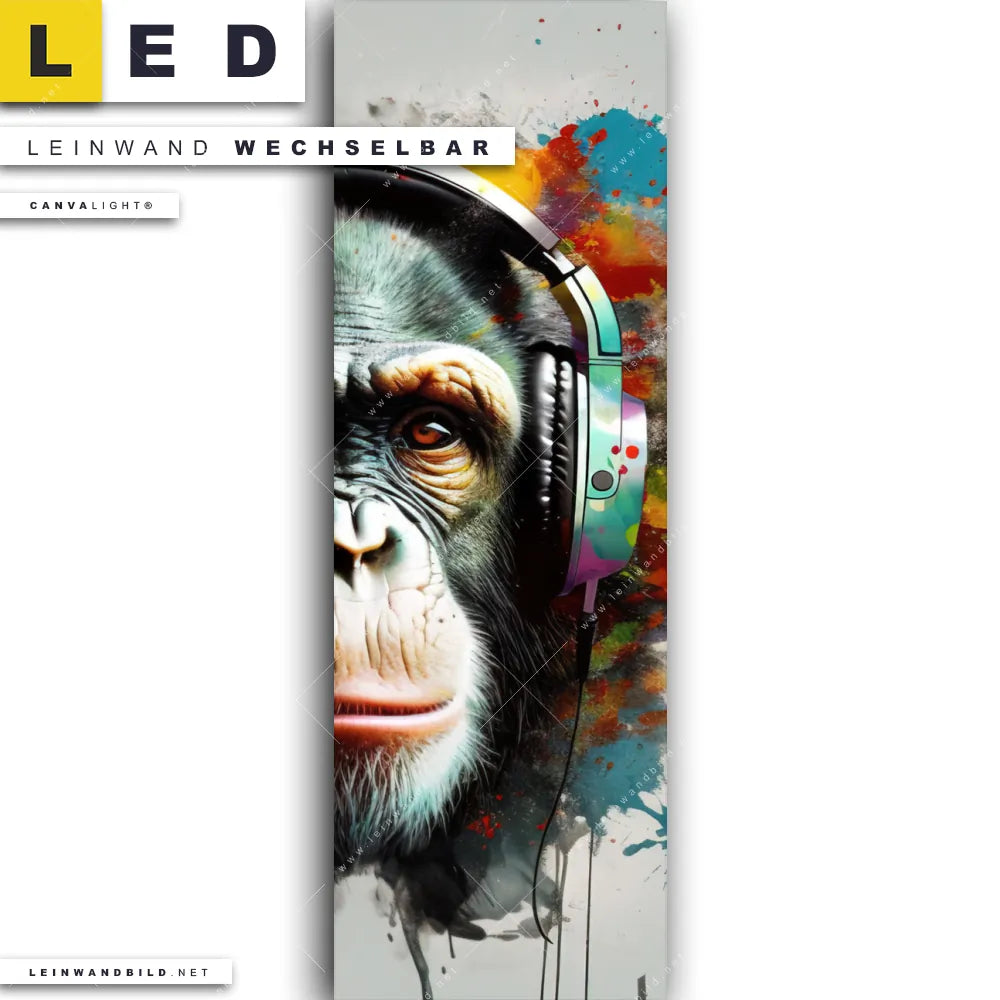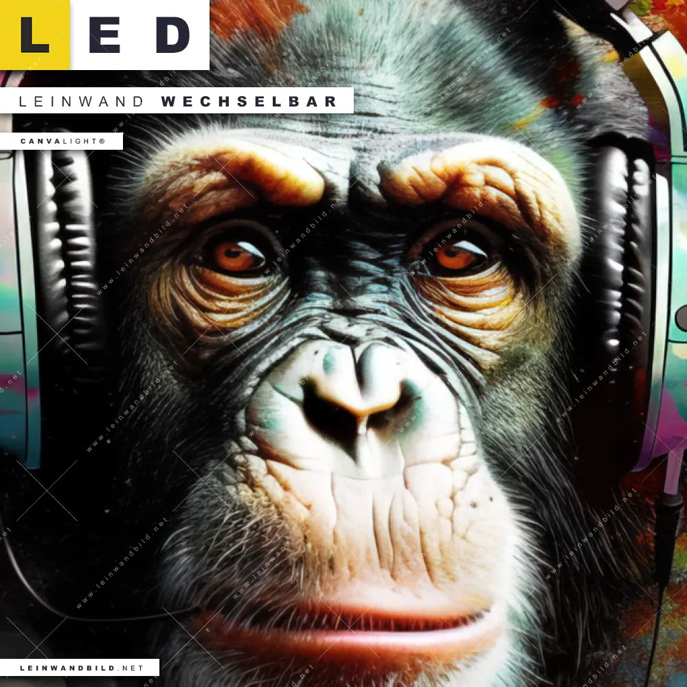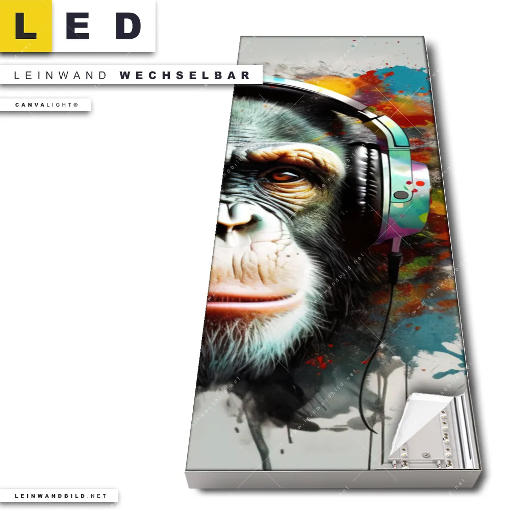 Du bist auf der Suche nach einem Tierwelt LED Leinwandbild im Schmalen Format? Begriffe wie Tier, Affe, Monkey, Chimpanzee, Schimpanse, Farbspritzer, Kopfhörer, Musik haben Dich auf der Suche nach Deinem neuen XXL LED Wandbild mit wechselbarer Leinwand inspiriert? Farben wie Bunt dürfen auf Deinem neuen Leinwand-LED-Bild im Panorama-Hochformat nicht fehlen und Leuchtbilder im Modern Art, Pop Art Stil passen perfekt zu Deinem Einrichtungsstil?