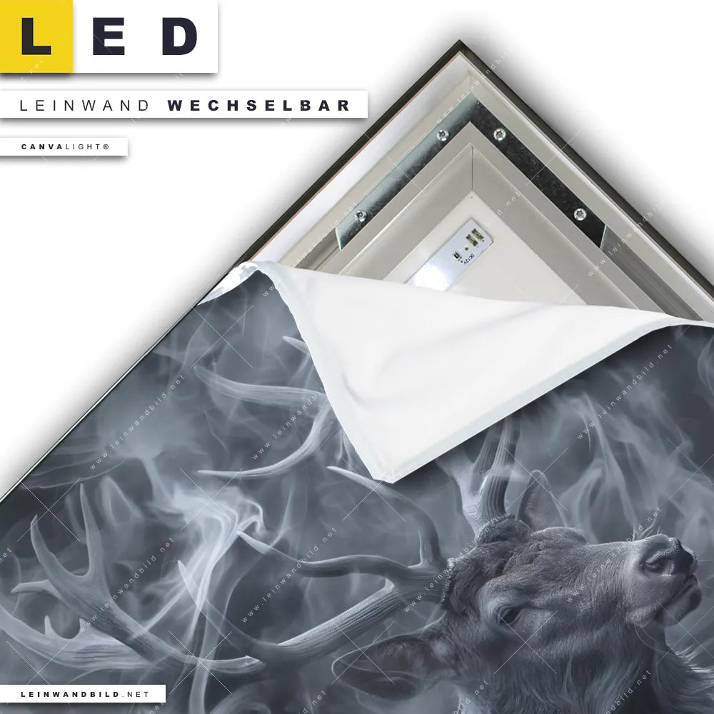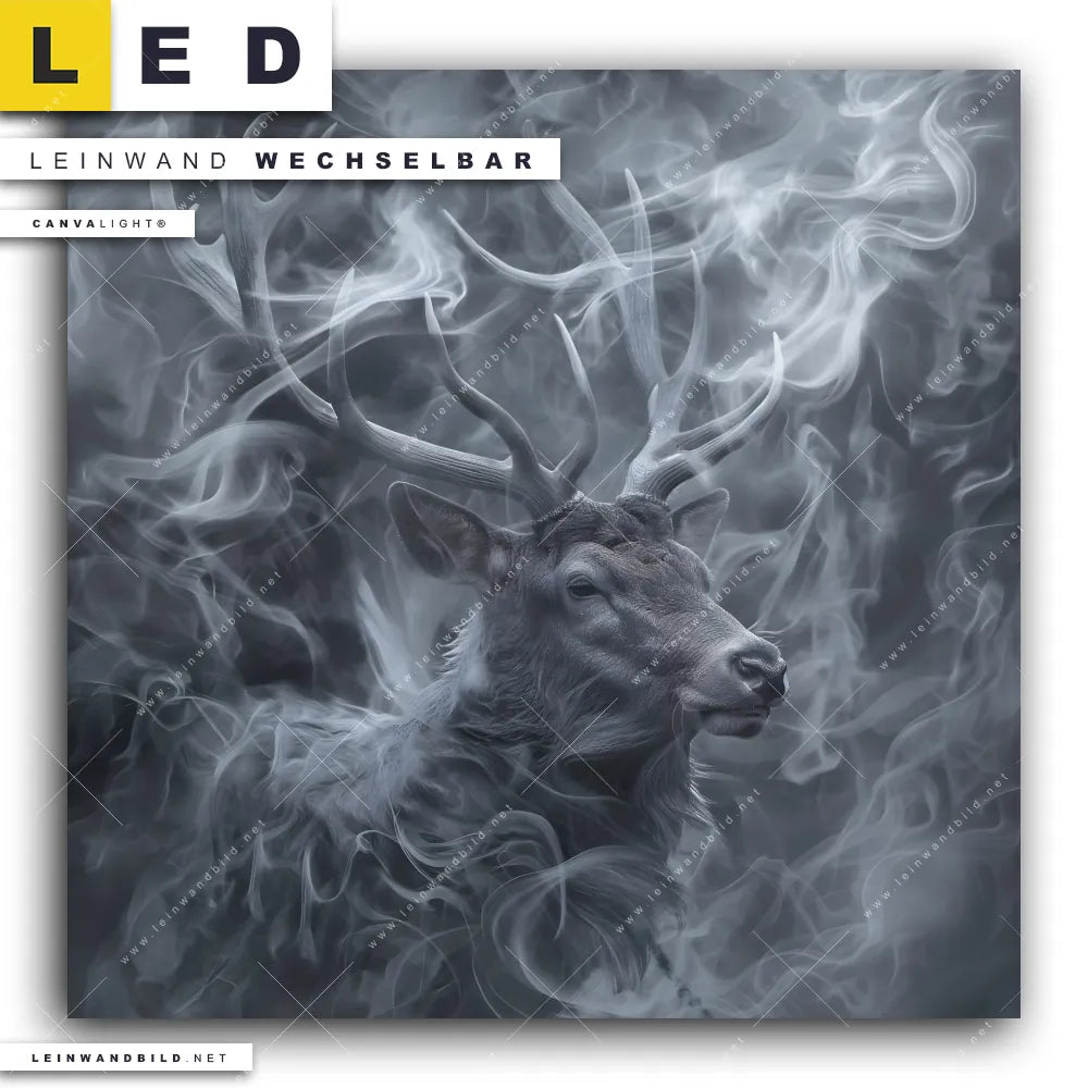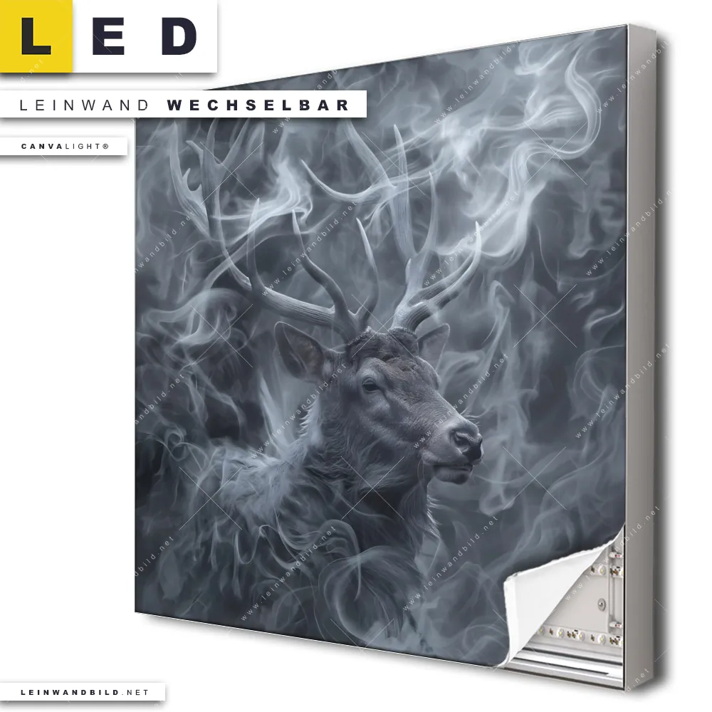 Du bist auf der Suche nach einem Tierwelt LED Leinwandbild im Quadratischen Format? Begriffe wie Hirsch, Nebel, Geweih, Magie, Rotwild, Wald, Rothirsch, Rauch, Qualm haben Dich auf der Suche nach Deinem neuen XXL LED Wandbild mit wechselbarer Leinwand inspiriert? Farben wie Schwarz dürfen auf Deinem neuen Leinwand-LED-Bild nicht fehlen und Leuchtbilder im Modern Art, Natürlich - Realistisch Stil passen perfekt zu Deinem Einrichtungsstil?
