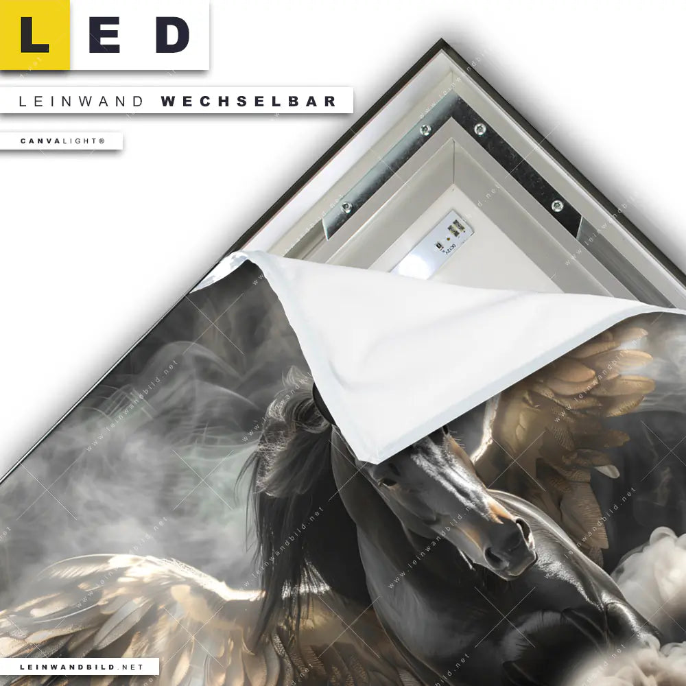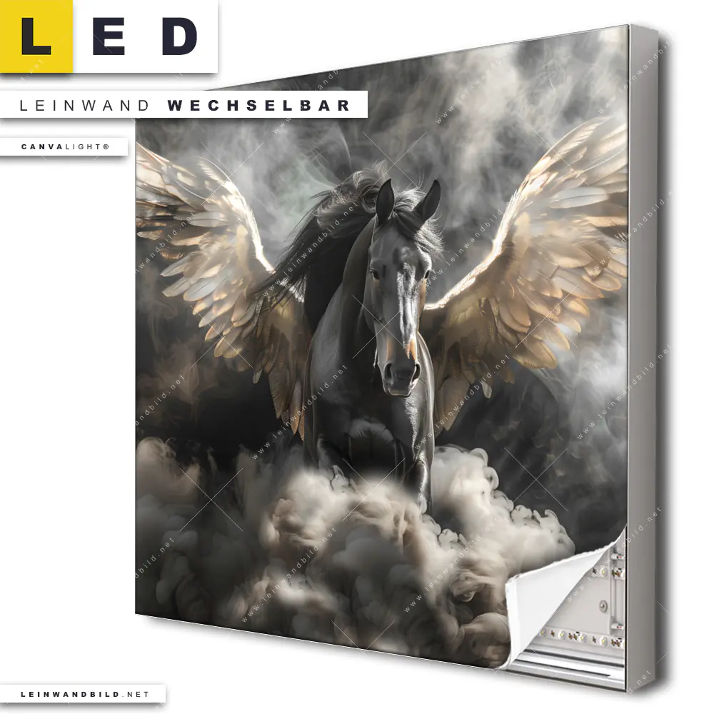 Du konfigurierst Dein individuelles LED Leinwandbild Canvalight® TEX | Mystisches Pferd mit Flügeln | Quadrat und wir produzieren es NEU für Dich. Unsere Tierwelt LED Bilder mit wechselbarer Textil-Leinwand sind KEINE Lagerware. Du bist Dir unsicher, welches Motiv oder Format das richtige für dein individuelles Canvalight® Leuchtbild ist, dann helfen wir dir gerne weiter und beraten dich!