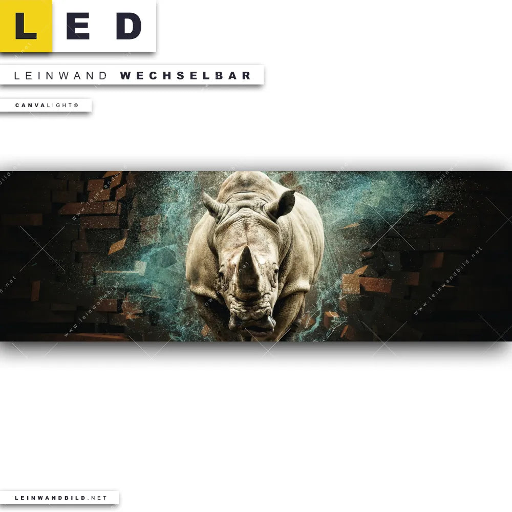 LED Leinwandbild Canvalight® TEX | Nashorn zerstört Wand | Panorama