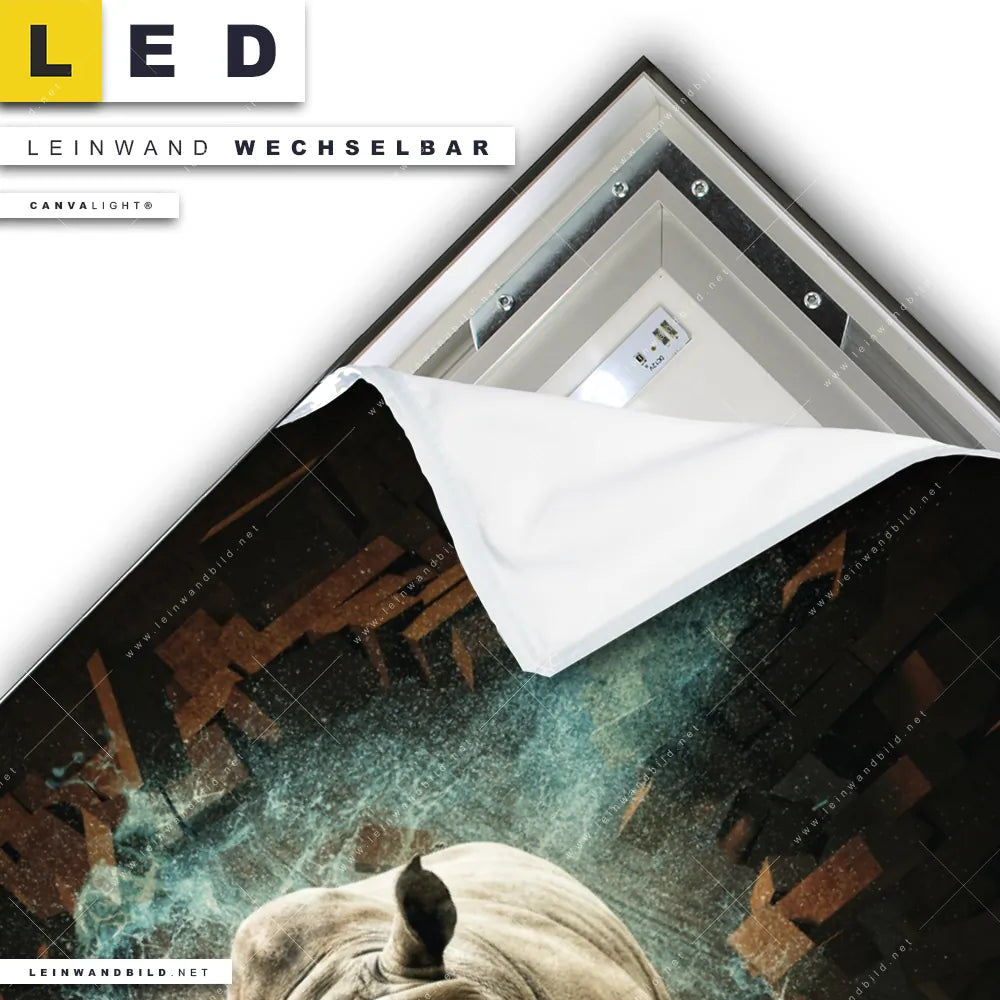 Du konfigurierst Dein individuelles LED Leinwandbild Canvalight® TEX | Nashorn zerstört Wand | Querformat und wir produzieren es NEU für Dich. Unsere Tierwelt LED Bilder mit wechselbarer Textil-Leinwand sind KEINE Lagerware. Du bist Dir unsicher, welches Motiv oder Format das richtige für dein individuelles Canvalight® Leuchtbild ist, dann helfen wir dir gerne weiter und beraten dich!
